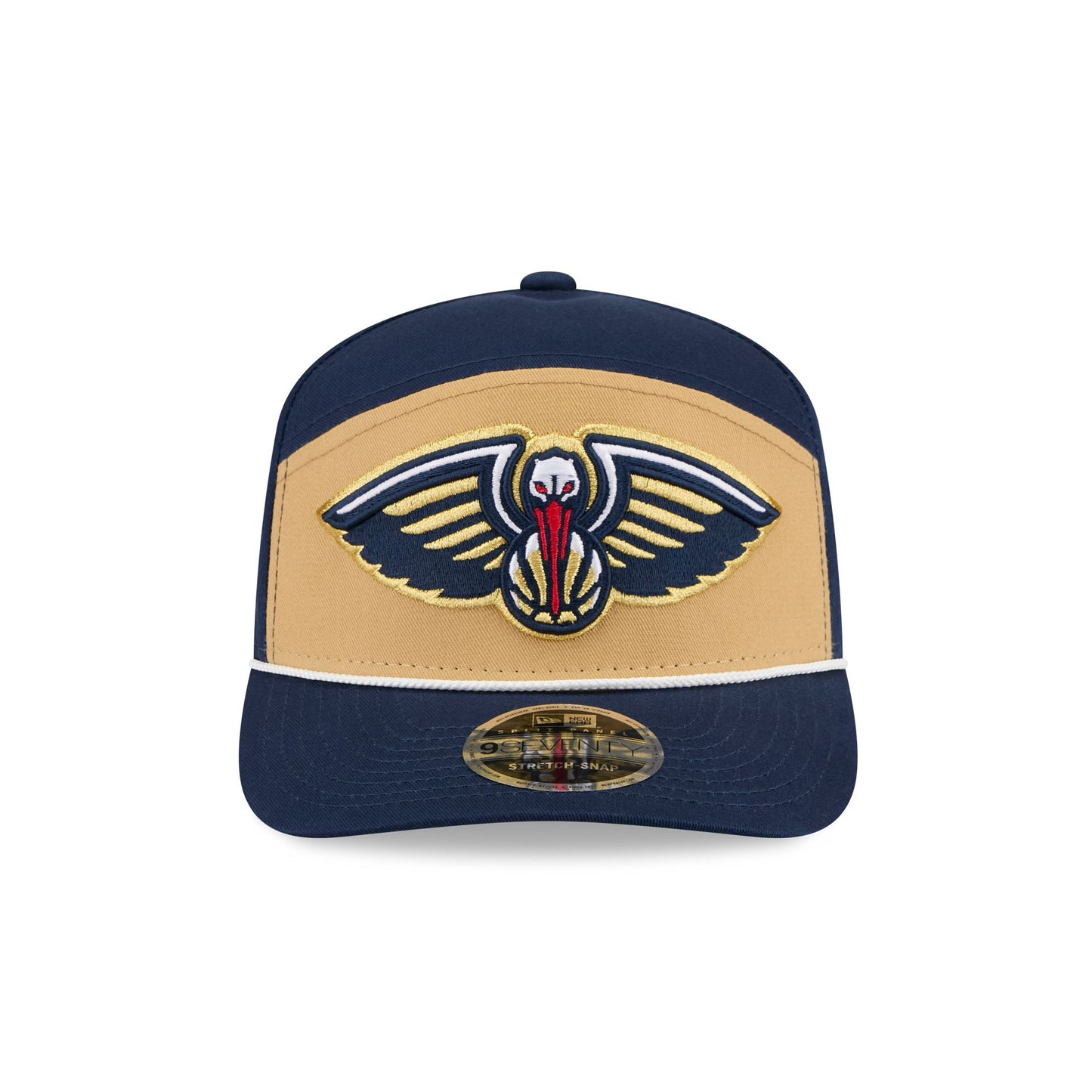 The New Orleans Pelicans Split Panel 9SEVENTY Stretch-Snap features an embroidered Pelicans logo at the front panel with a split crown construction and a rope at the visor. Additional details include an adjustable stretch-snap closure at the rear and a gray undervisor.