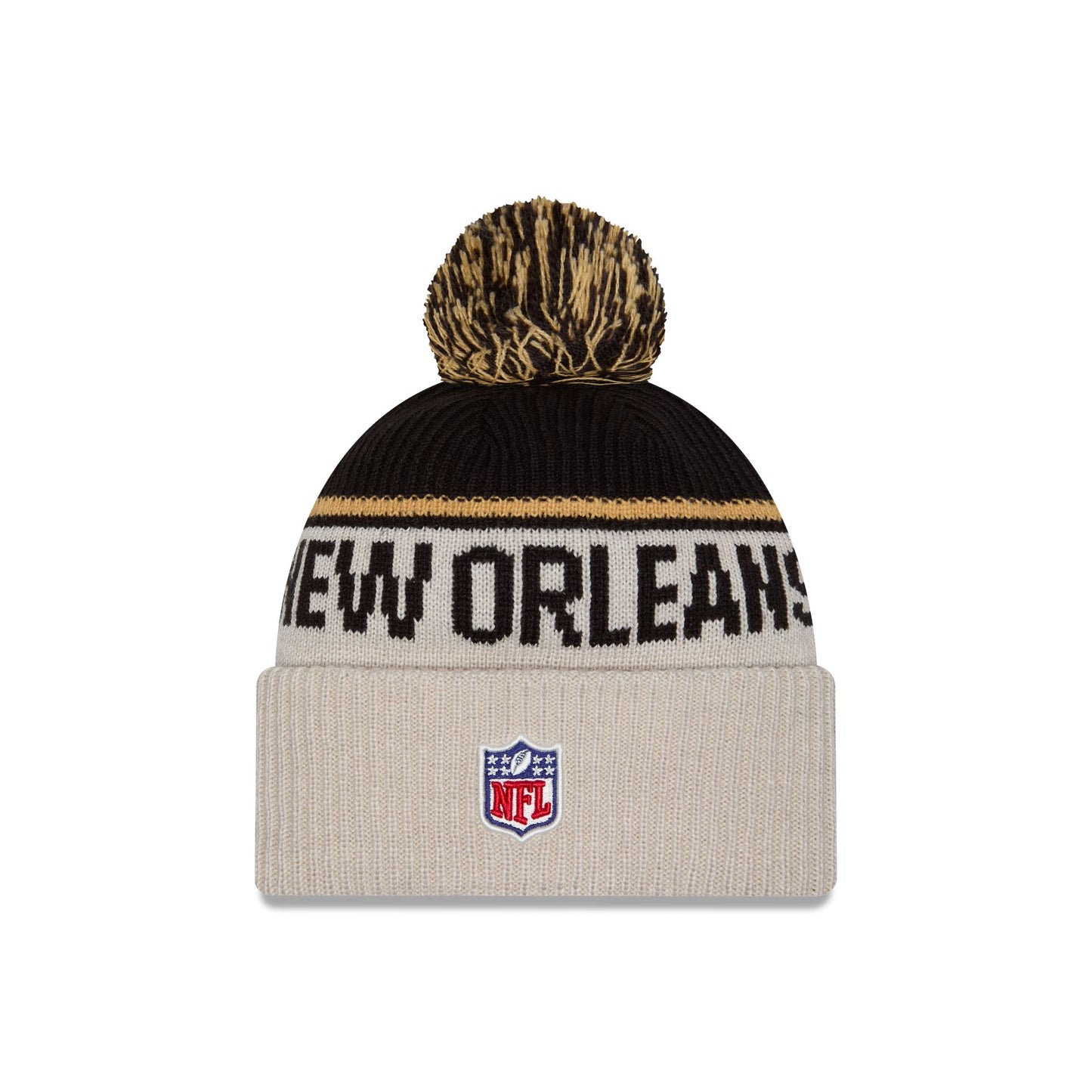 The New Orleans Saints 2024 Cold Weather Historic Pom Knit Hat features an embroidered Saints Historic logo at the front cuff with a matching NFL Shield at the rear. Additional details include a team wordmark at the crown and a one-time removable pom.