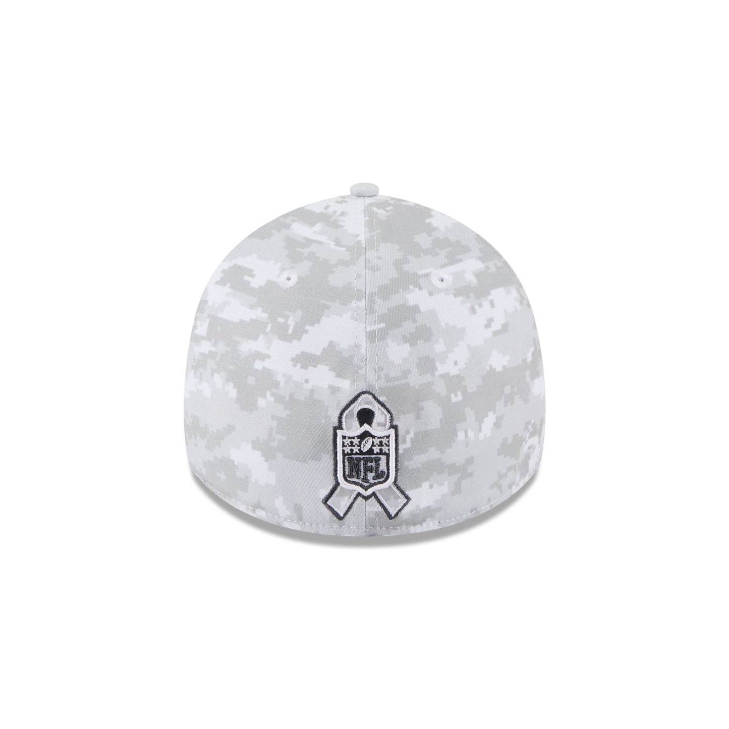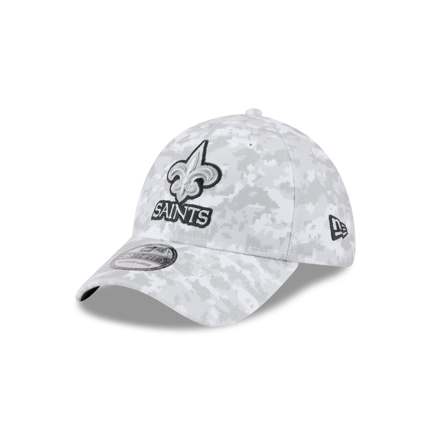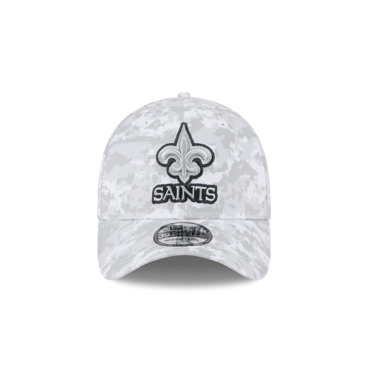 The New Orleans Saints 2025 Salute to Service Fan Gear 39THIRTY Stretch Fit Cap features an embroidered Saints logo at the front panels with the official NFL Salute to Service patch at the rear, an American flag patch at the right-wear side, and a team color undervisor.