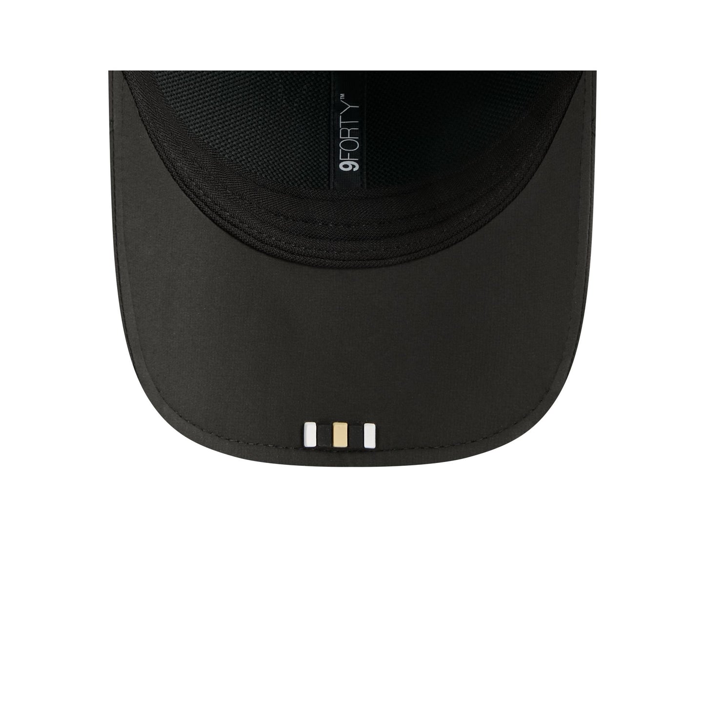 The New Orleans Saints 2025 Sideline Hot Weather 9FORTY M-Crown Snapback features a sewn-down silicone Saints logo patch at the front panels with a water-repellent quill tech fabrication throughout and a quick-dry cushioned sweatband to absorb moisture. Additional details include the Official NFL Shield logo to the right of a soft silicone snapback closure at the rear and mesh accents at the visor sides and side crown panels. The undervisor is accented with a silicone transfer in the team’s colors.