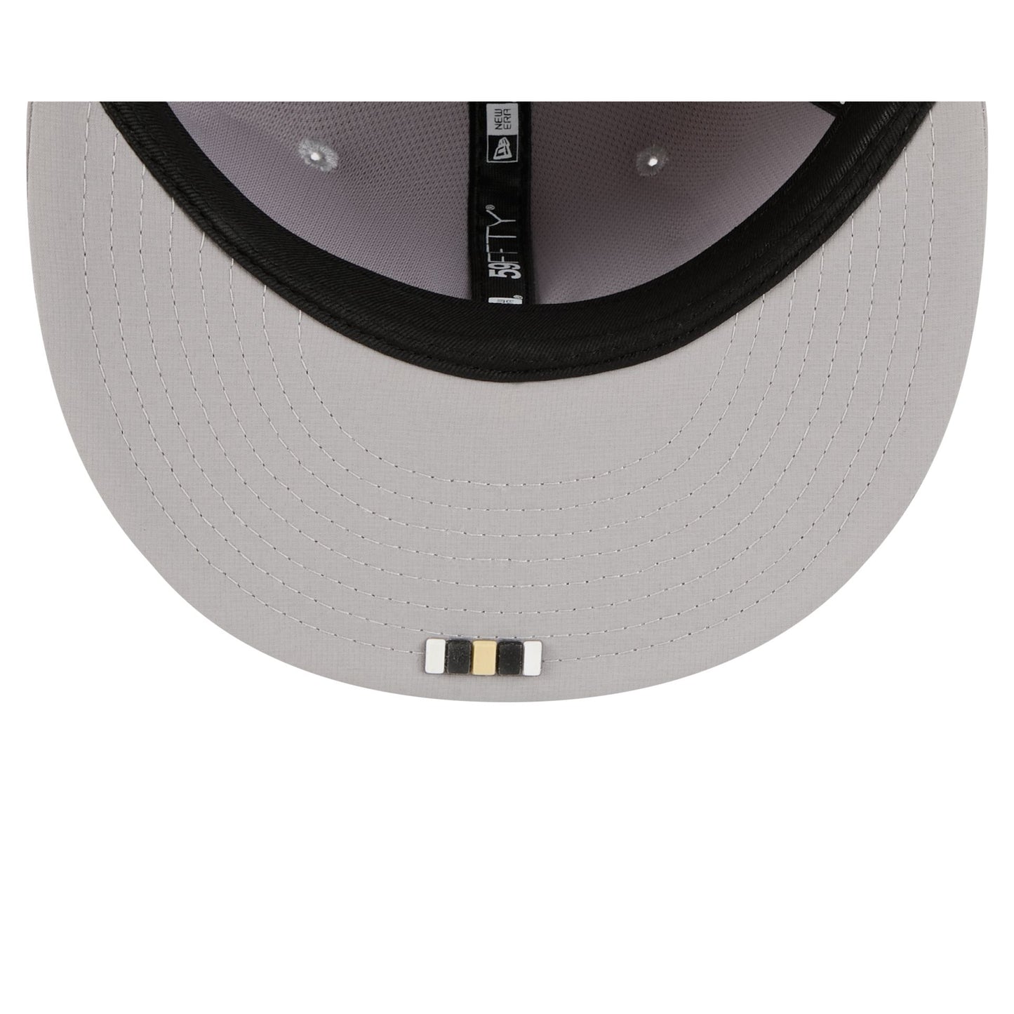 The New Orleans Saints 2025 Sideline Hot Weather Gray 59FIFTY Fitted Cap features a sewn-down silicone Saints logo patch at the front panels with a matching Official NFL Shield logo at the rear. The cap has a water-repellent quill tech fabrication throughout, with a quick-dry cushioned sweatband to absorb moisture. The undervisor is accented with a silicone transfer in the team’s colors.