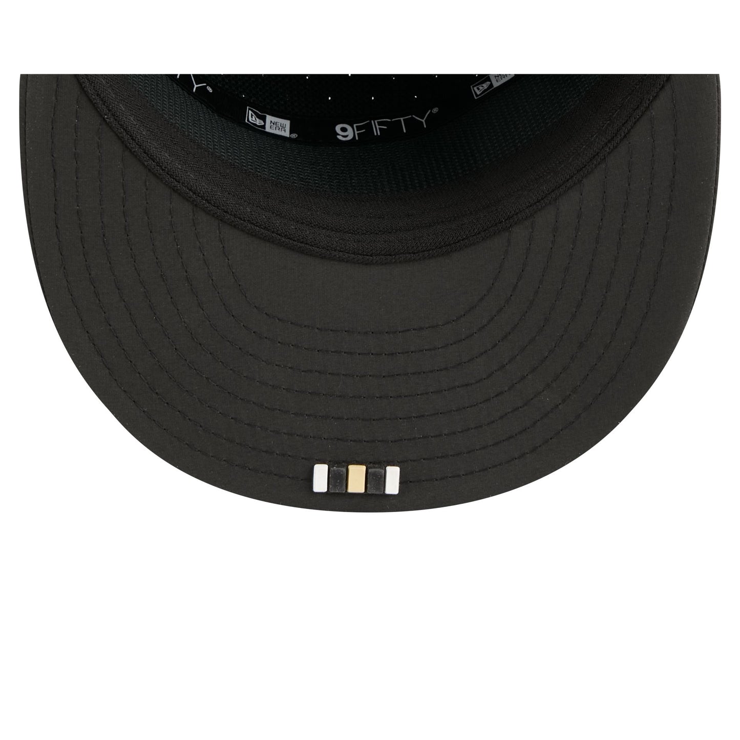 The New Orleans Saints 2025 Sideline Hot Weather Split Panel 9FIFTY Snapback features a sewn-down silicone Saints logo patch at the front panels with a split-crown construction. The cap has a water-repellent quill tech fabrication throughout, with a quick-dry cushioned sweatband to absorb moisture. Additional details include the Official NFL Shield logo to the right of a soft silicone snapback closure at the rear. The undervisor is accented with a silicone transfer in the team’s colors.