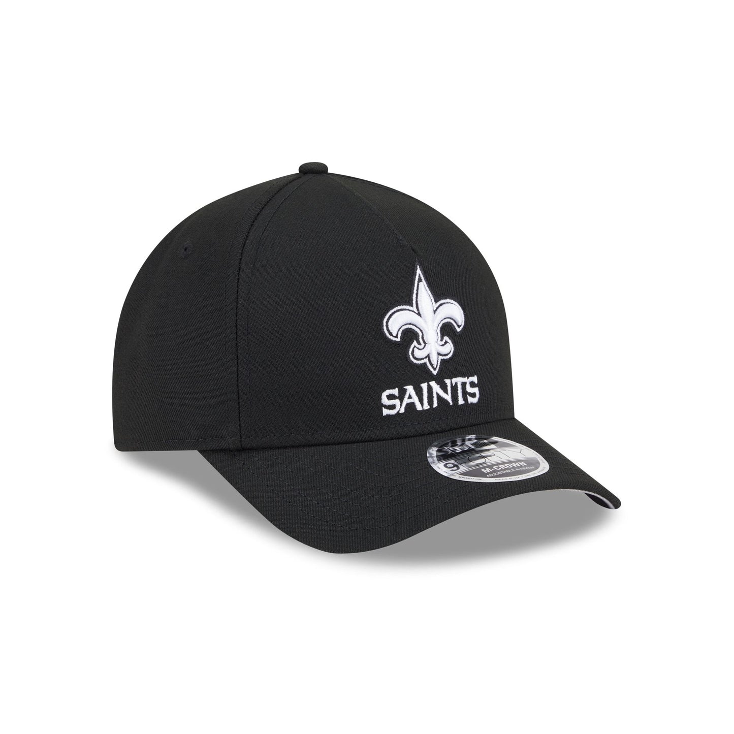 The New Orleans Saints Black & White 9FORTY M-Crown A-Frame Snapback features an embroidered Saints logo at the front panels with an adjustable snapback closure at the rear and a gray undervisor.