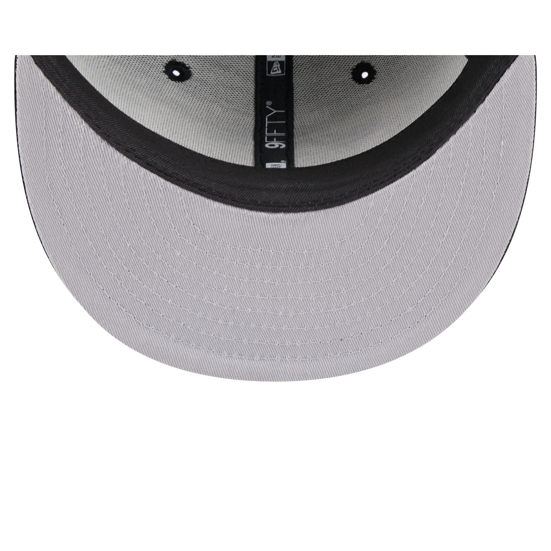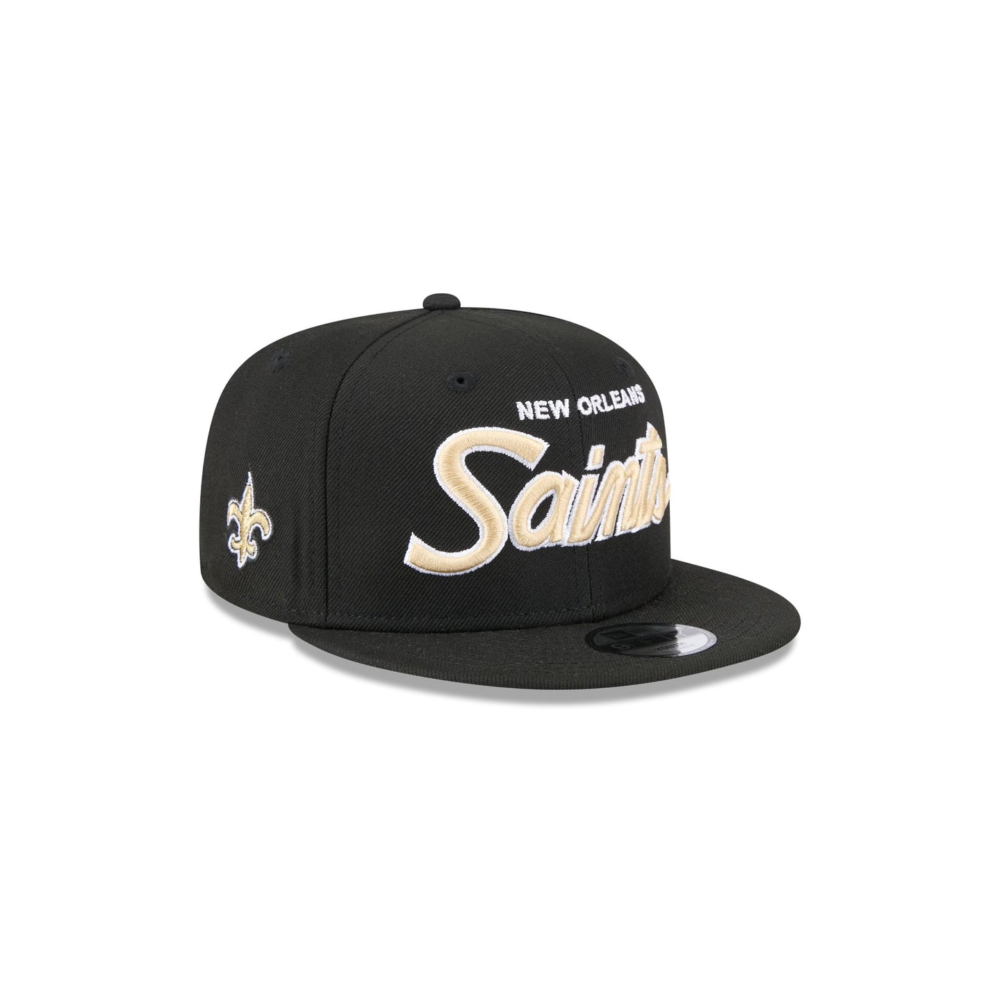 The New Orleans Saints Kids 9FIFTY Snapback Hat features an embroidered Saints wordmark at the front panels with a matching team logo at the right-wear side. Additional details include a gray undervisor and a snapback closure at the rear.