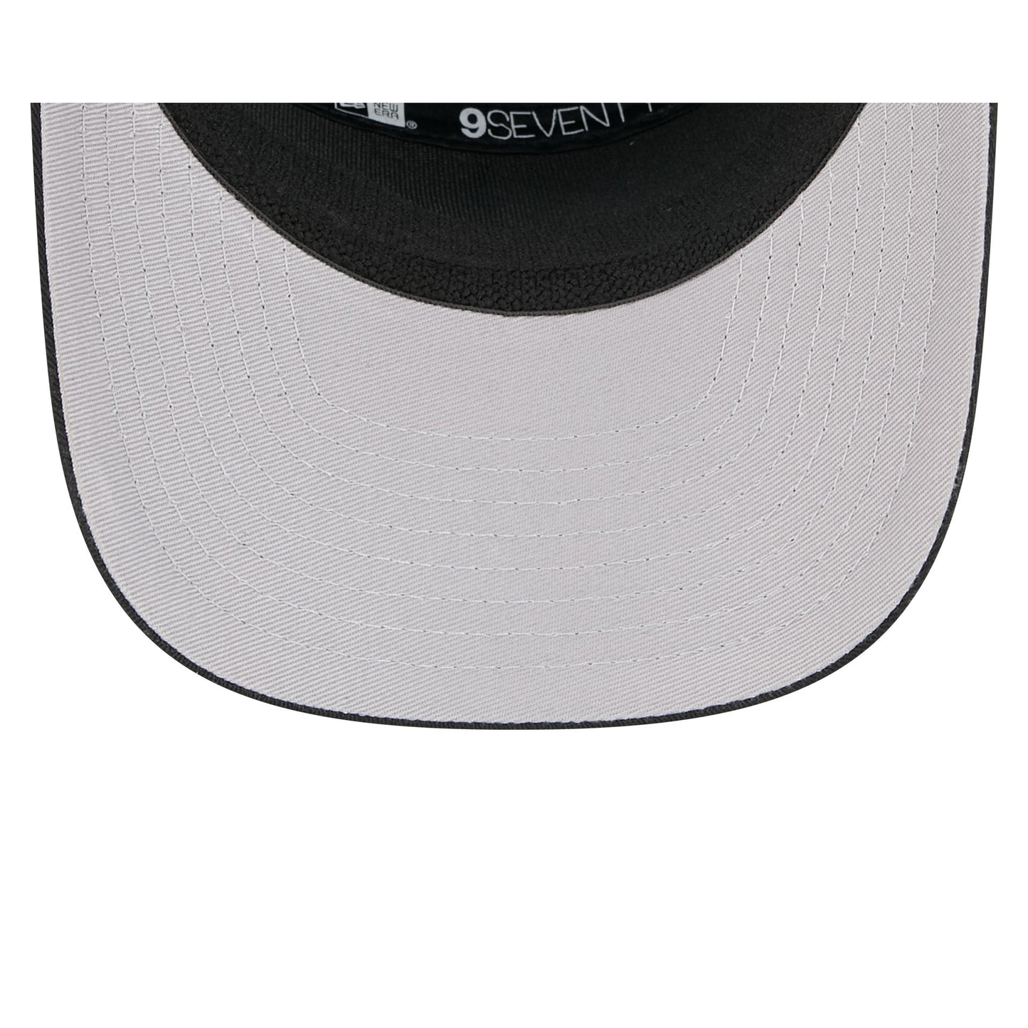 The New Orleans Saints Split Panel 9SEVENTY Stretch-Snap features an embroidered Saints logo at the front panel with a split crown construction and a rope at the visor. Additional details include an adjustable stretch-snap closure at the rear and a gray undervisor.
