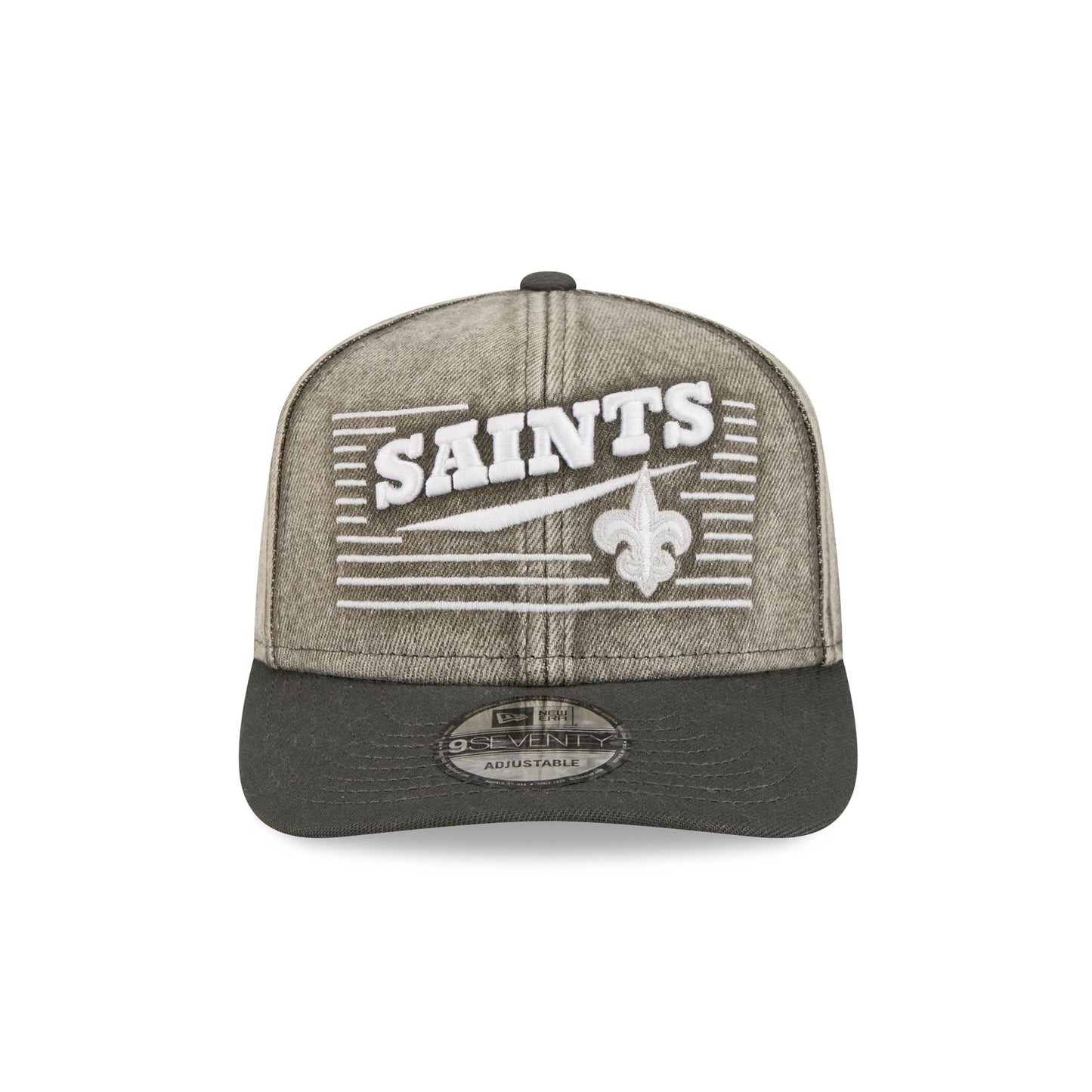 The New Orleans Saints Washed Denim 9SEVENTY Stretch-Snap features an embroidered Saints graphic at the front panels against a washed denim fabrication throughout and an adjustable stretch-snap fabrication throughout.