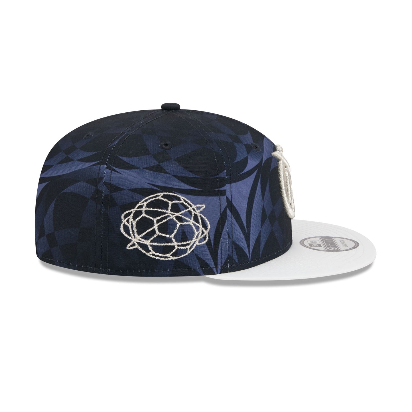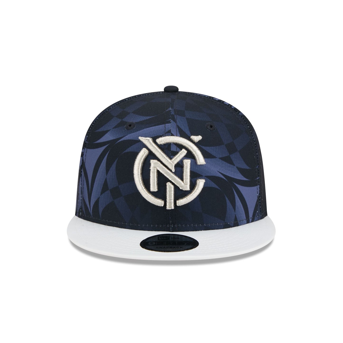 The New York City FC 2026 Jersey Hook 9FIFTY Snapback features an embroidered New York City FC logo at the front panels with a team patch at the right-wear side. Additional details include a team graphic above an adjustable snapback closure at the rear.