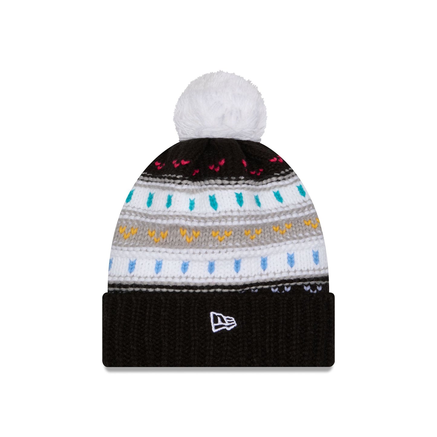 The New York Giants 2025 Crucial Catch Women's Pom Knit features an embroidered Giants logo at the front with an NFL Shield at the rear, a Crucial Catch Intercept Cancer patch at the right-wear side, and a one-time removeable pom.