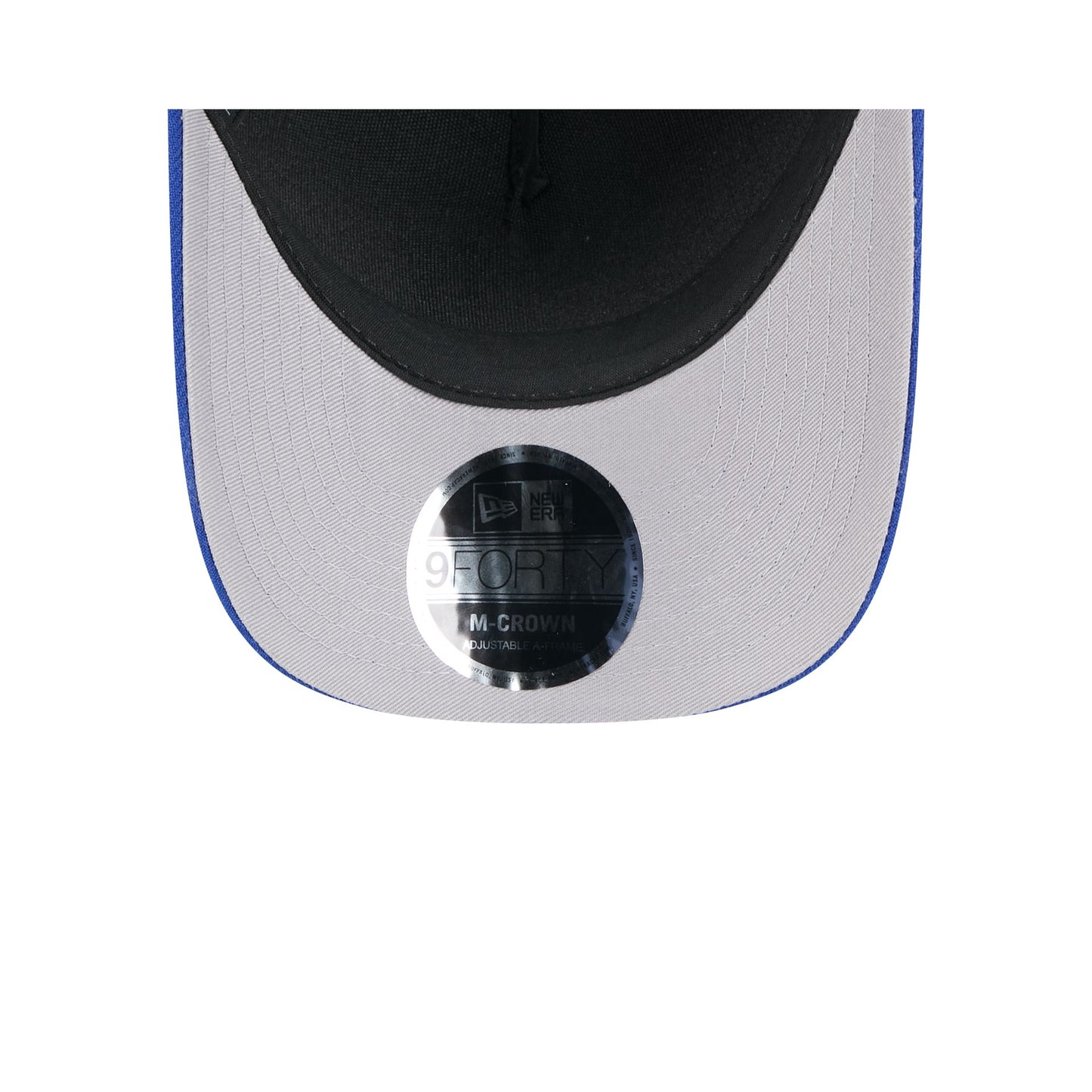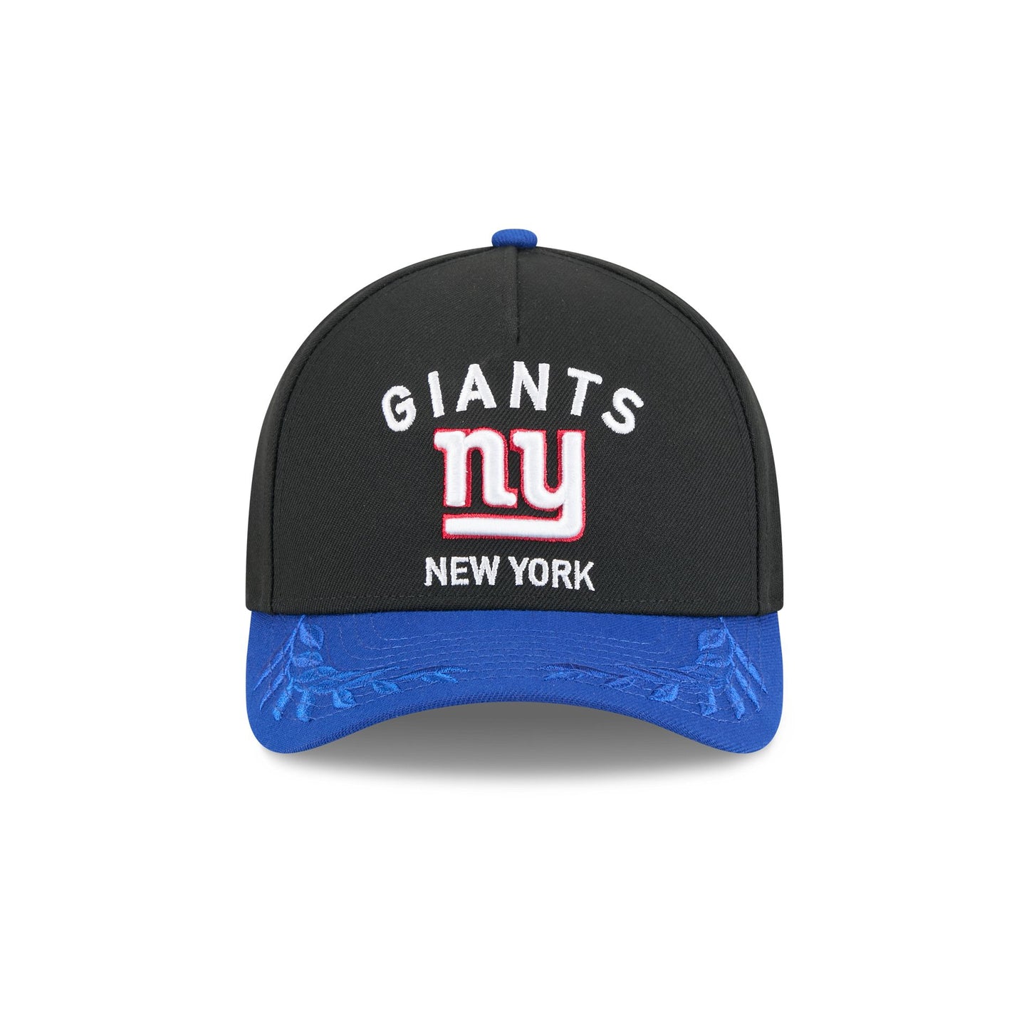 The New York Giants 2025 Draft 9FORTY M-Crown A-Frame Snapback features an embroidered Giants logo and wordmark at the front panels with an NFL Shield logo above a snapback closure at the rear. Additional details include ornamental stitched details at the visor and a gray undervisor.