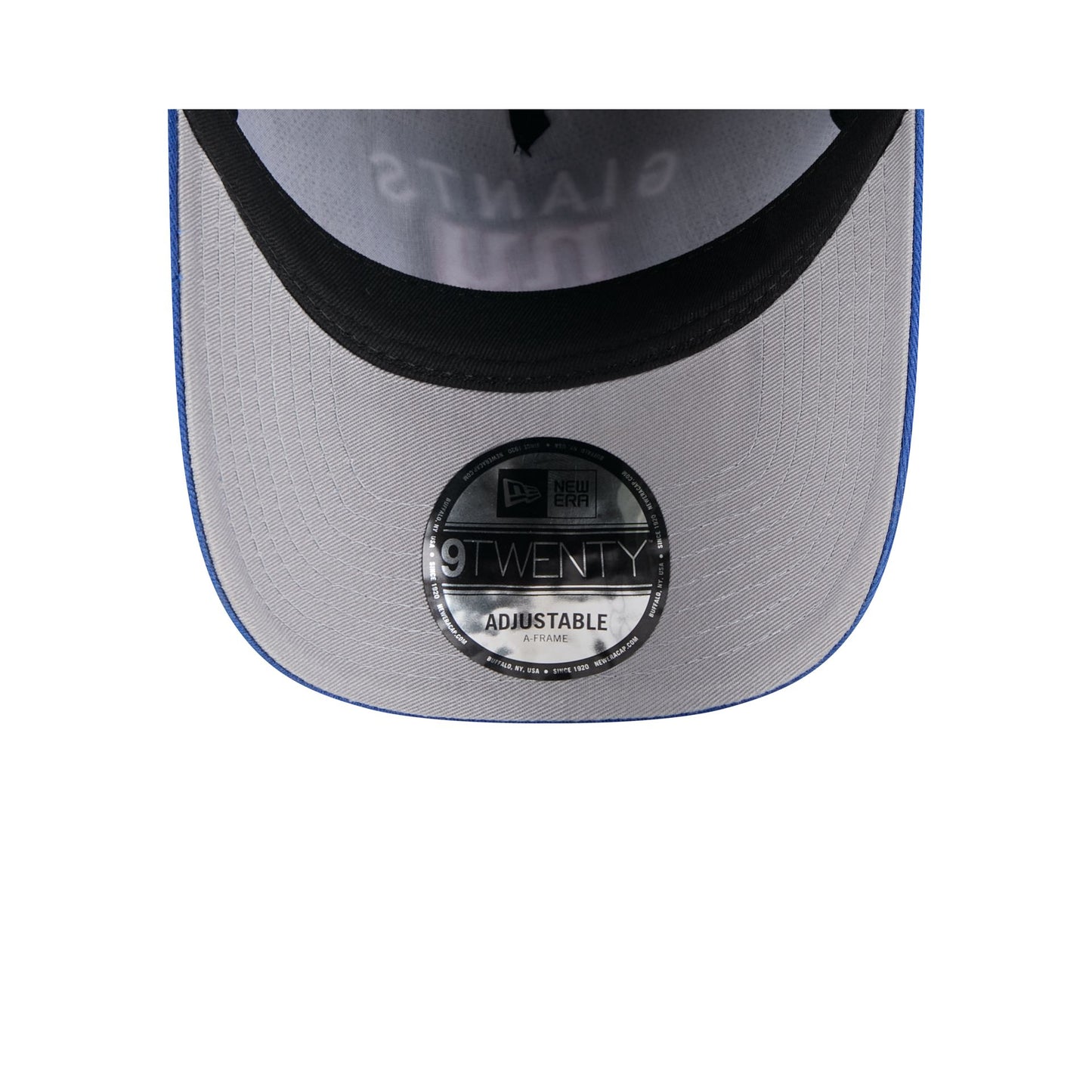 The New York Giants 2025 Draft 9TWENTY A-Frame Adjustable Cap features an embroidered Giants logo and wordmark at the front panels with an NFL Shield logo above an adjustable D-Ring closure at the rear. Additional details include ornamental stitched details at the visor and a gray undervisor.