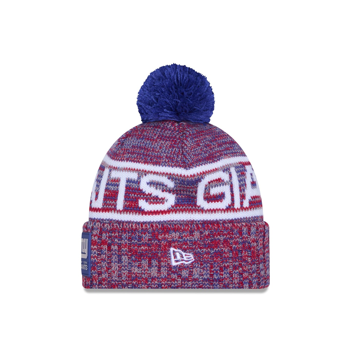 The New York Giants 2025 Sideline Cold Weather Pom Knit Hat features a sewn-down silicone Giants logo patch at the front cuff with a matching Official NFL Shield logo at the rear. Additional details include a team wordmark across the crown, a one-time removeable pom, and a fleece lining.