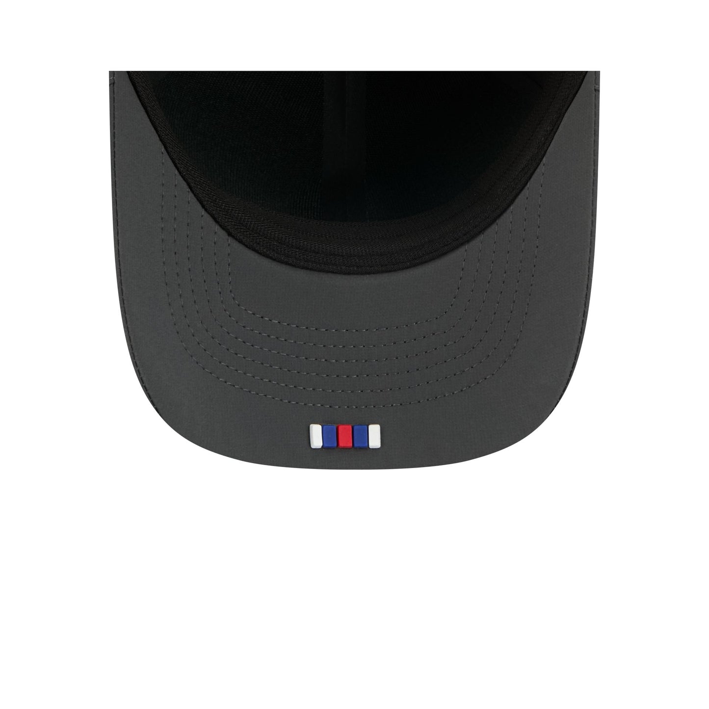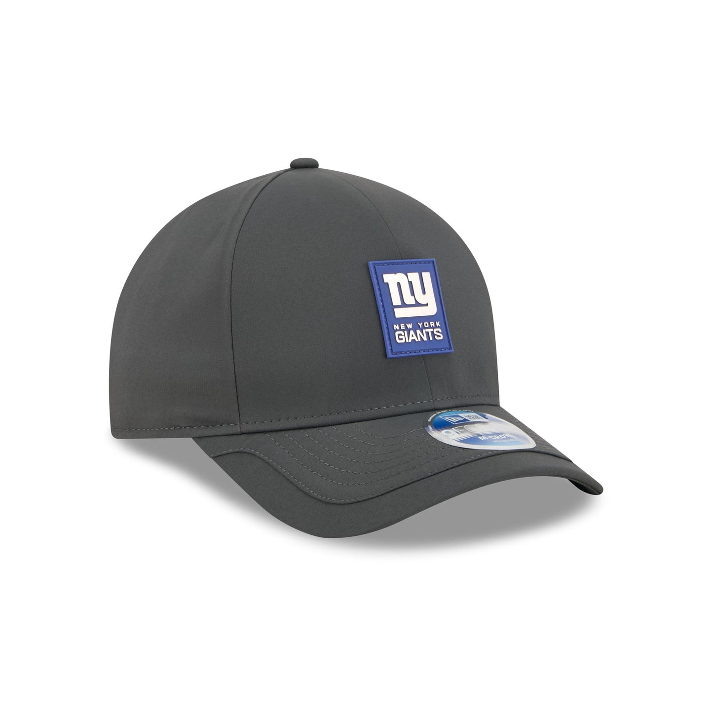 The New York Giants 2025 Sideline Cold Weather Steel Clouds 9FORTY M-Crown Snapback features a sewn-down silicone Giants logo patch at the front panels with a water-repellent quill tech fabrication throughout and a quick-dry cushioned sweatband to absorb moisture. Additional details include the Official NFL Shield logo to the right of a soft silicone snapback closure at the rear. The crown has bonded seams to trap warmth and the undervisor is accented with a silicone transfer in the team’s colors.