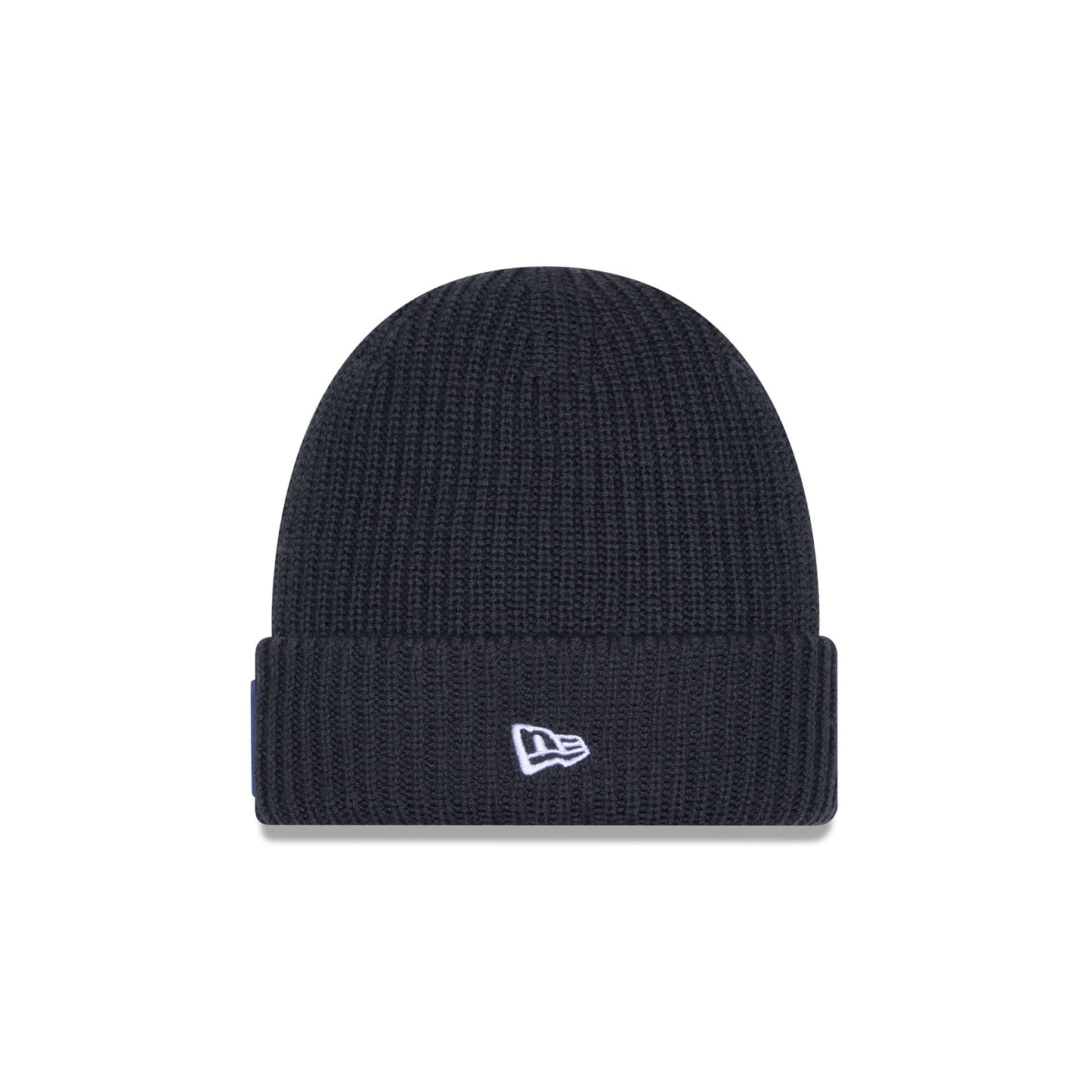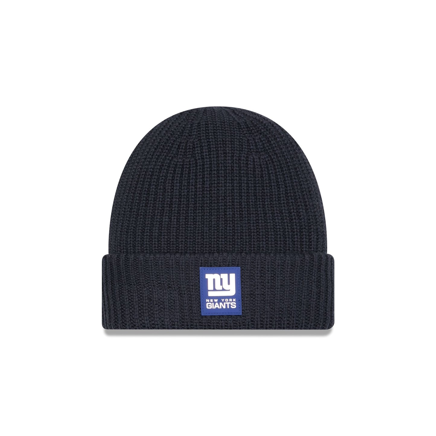 The New York Giants 2025 Sideline Cold Weather Steel Clouds Cuff Knit Beanie features a sewn-down silicone Giants logo patch at the front cuff with a matching Official NFL Shield logo at the rear. The beanie is knit from wool yarn and lined with fleece.
