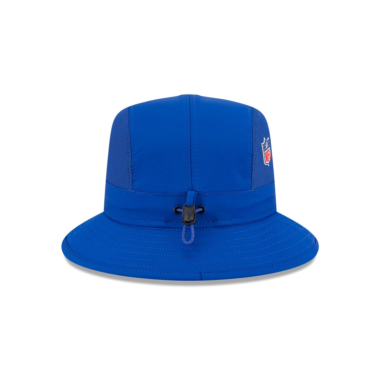 The New York Giants 2025 Sideline Hot Weather Bucket Hat features a sewn-down silicone Giants logo patch at the front with the Official NFL Shield logo at the right-wear side. Additional details include breathable mesh side panels and an adjustable reflective drawstring at the rear.