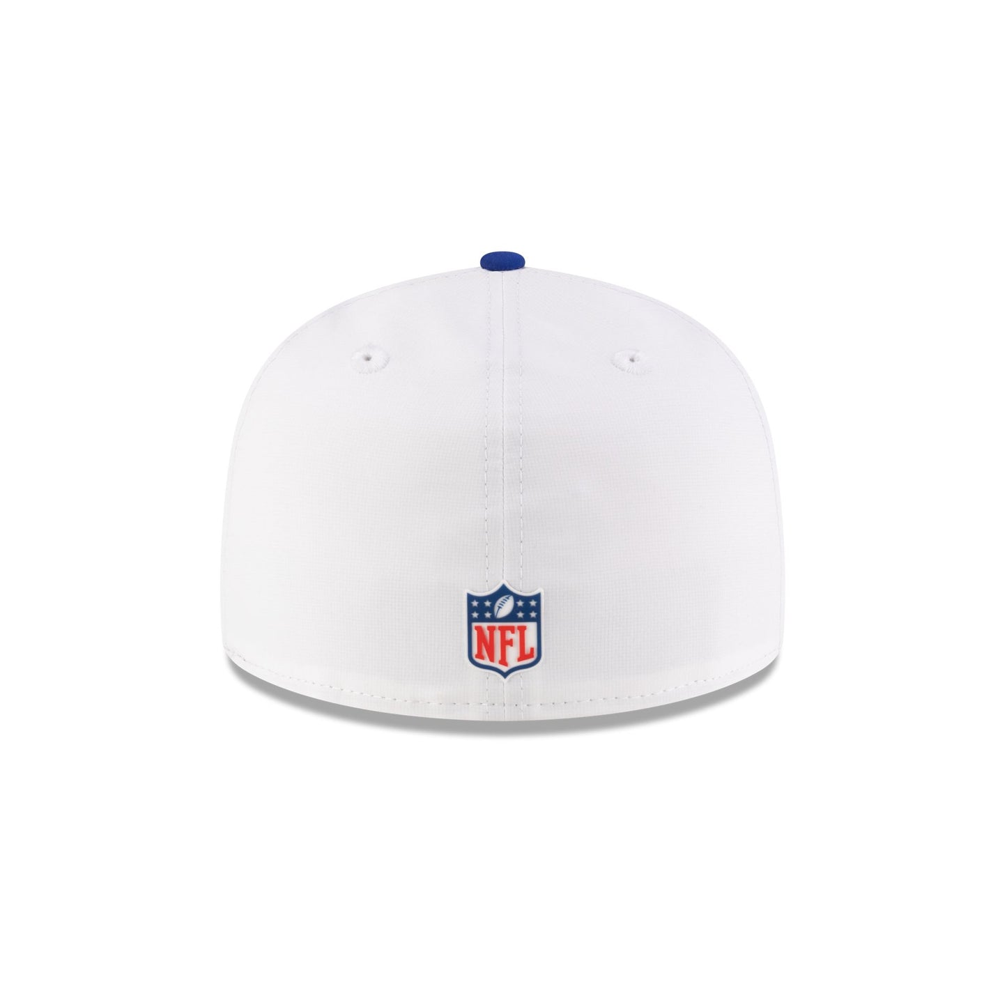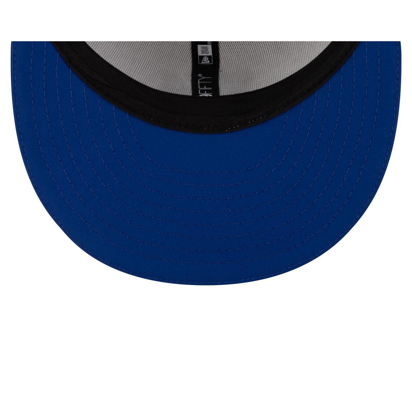 The New York Giants 2025 Training 59FIFTY Fitted Cap features a silicone Giants patch at the front panels with team color stripes at the front of a blue visor and a silicone NFL Shield patch at the rear.