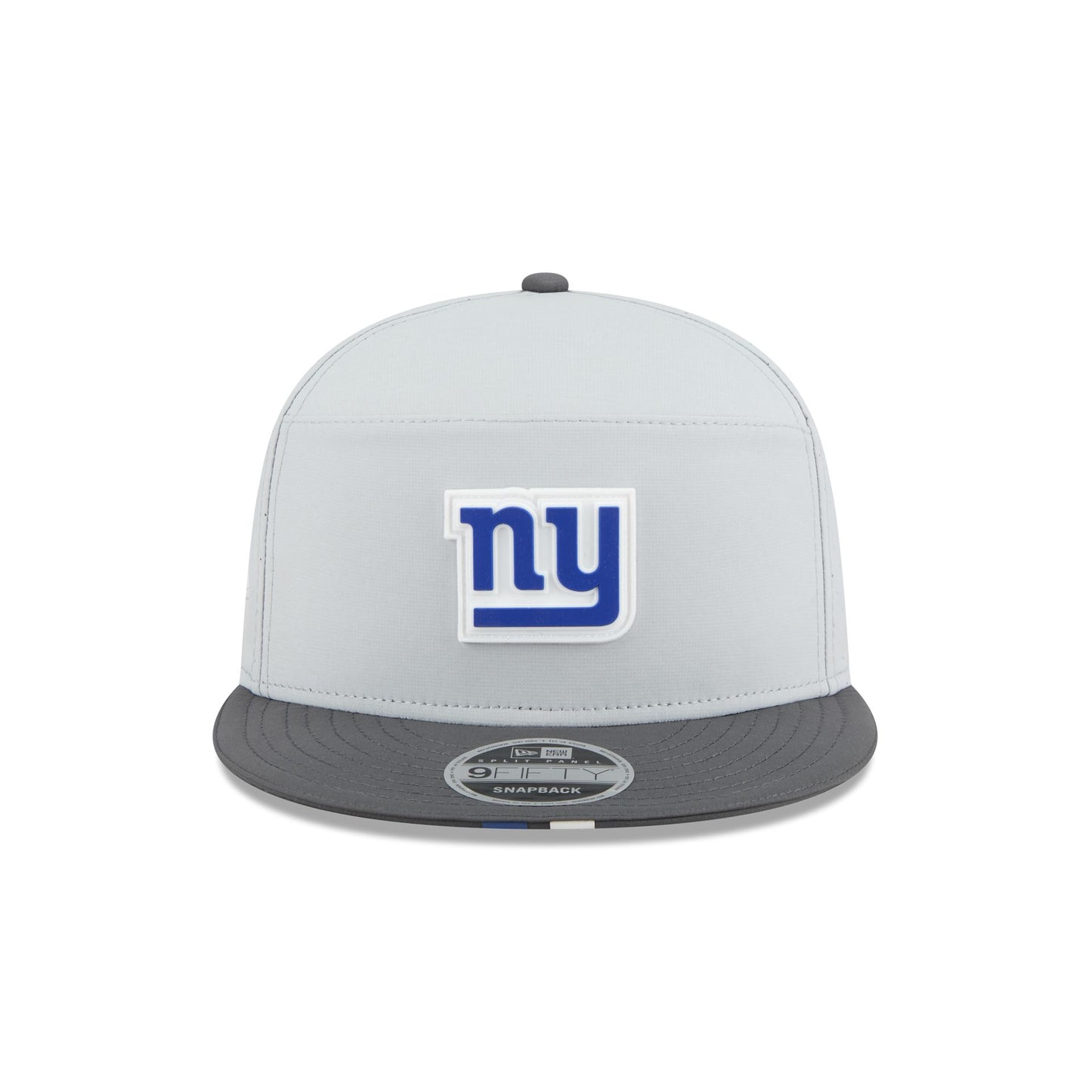 The New York Giants 2025 Training Gray Split Panel 9FIFTY Snapback features a silicone Giants patch at the front panel with team color stripes at the front of a gray visor. Additional details include a silicone NFL Shield patch on a woven foldover tab above a snapback closure at the rear.