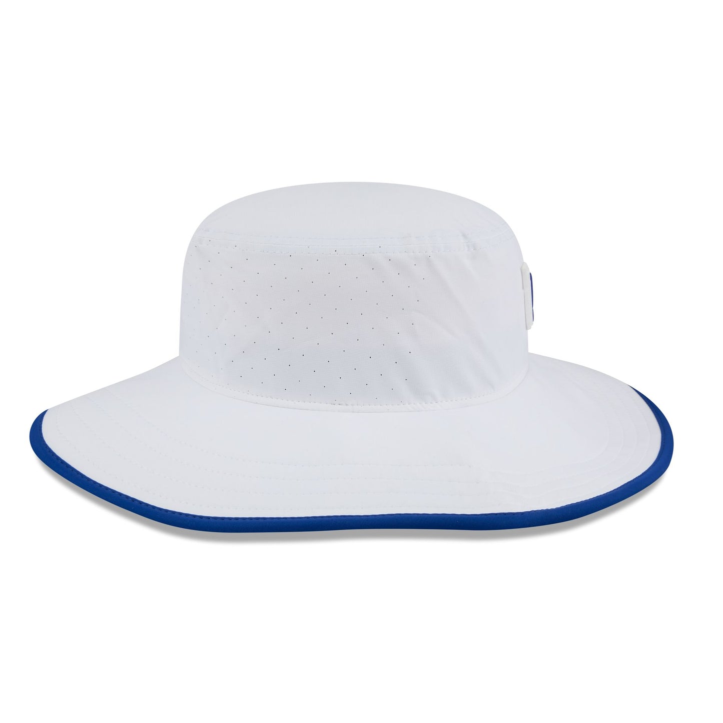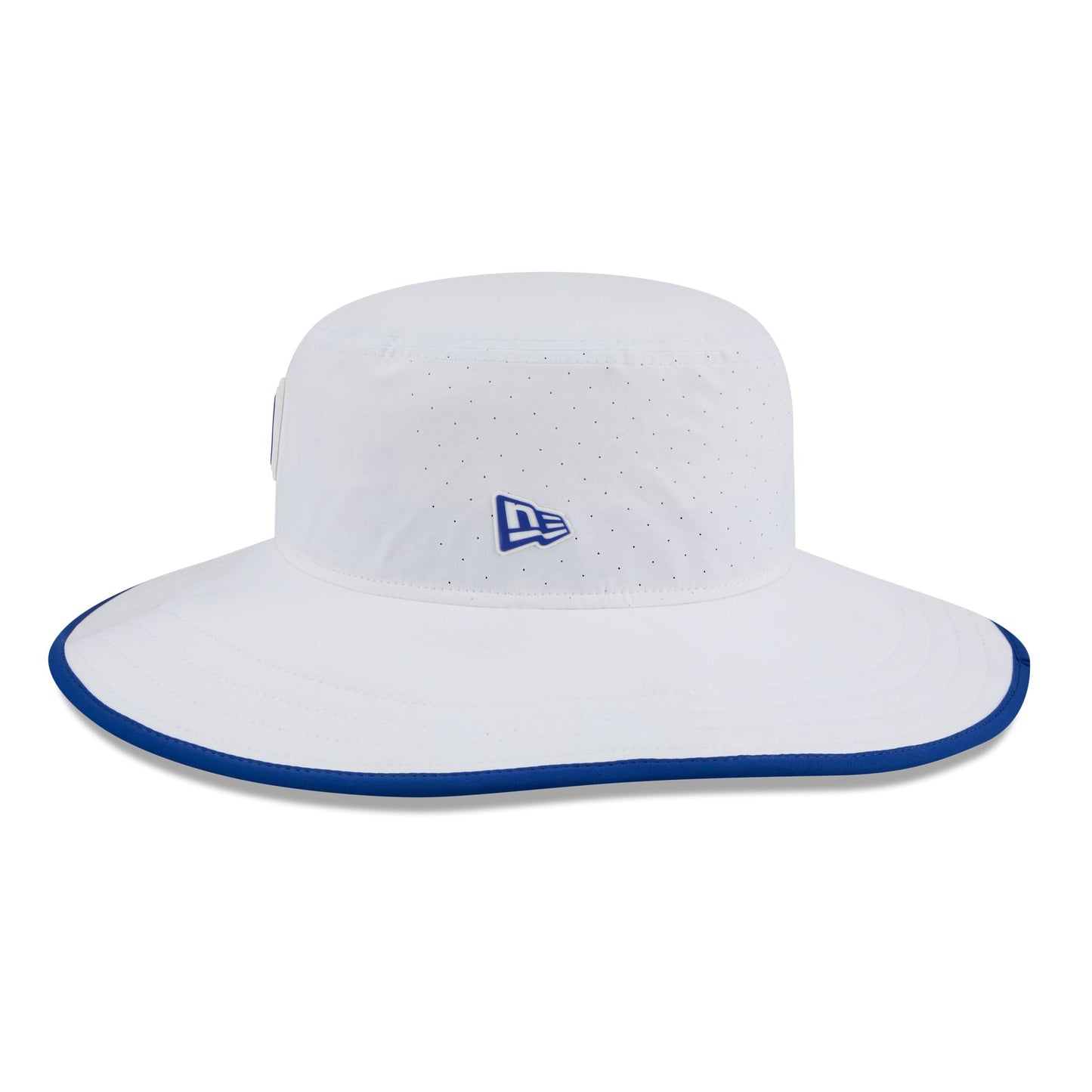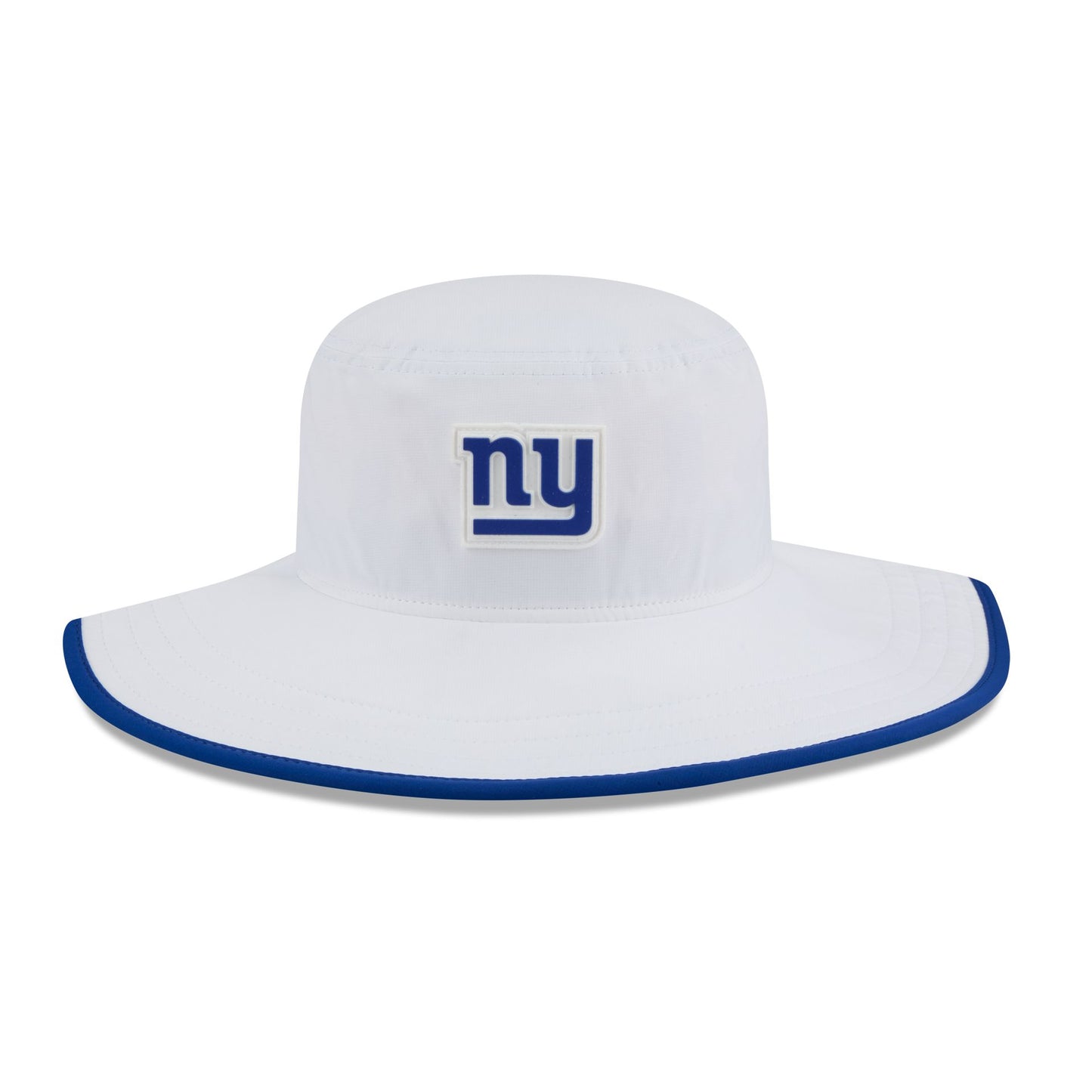 The New York Giants 2025 Training Panama Bucket Hat features a silicone Giants patch at the front panel with team color piping along the edge and a silicone NFL Shield patch on a woven foldover tab at the rear.