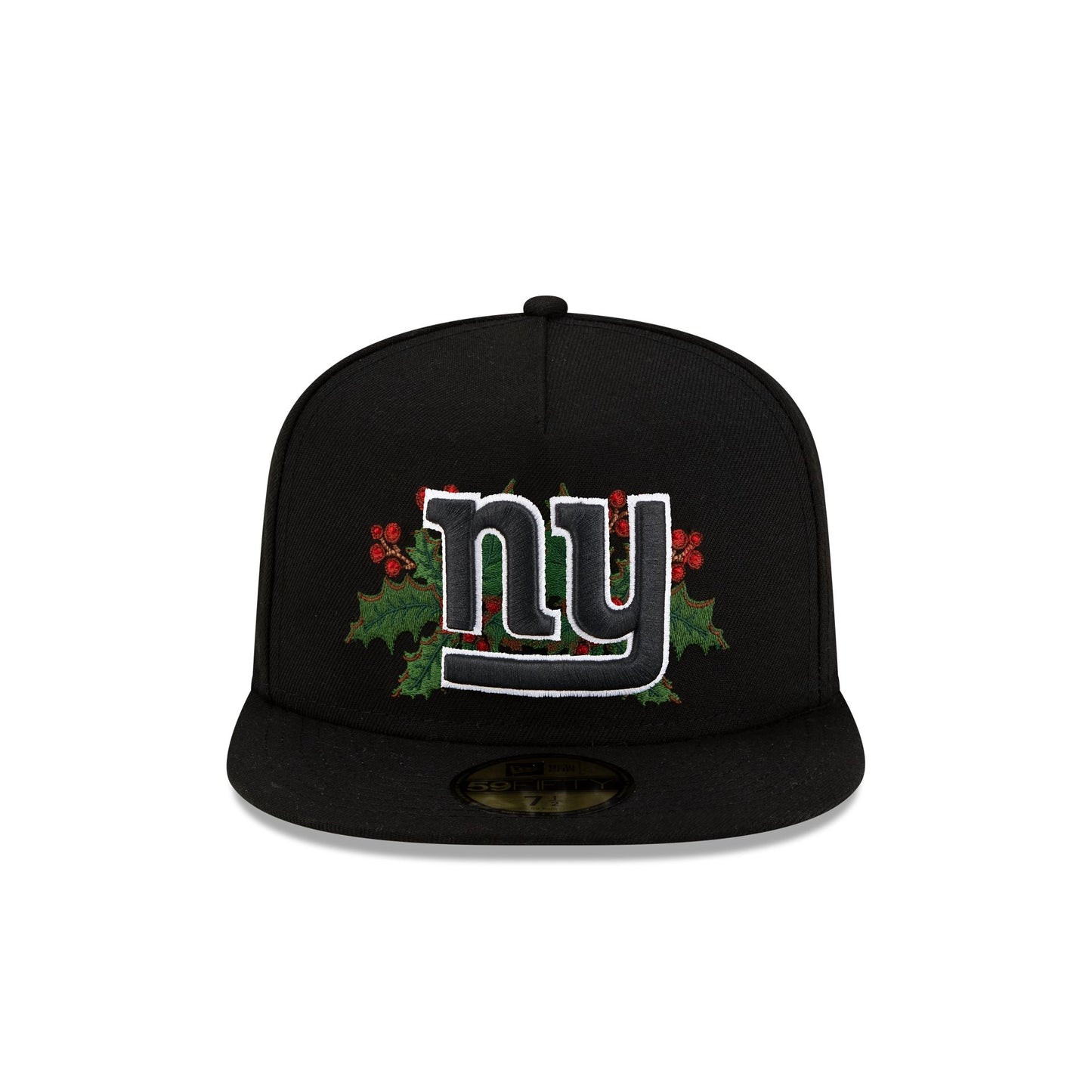 The New York Giants Holly 59FIFTY A-Frame Fitted Cap features an embroidered Giants black and white logo with holly at the front panels with a matching NFL Shield logo at the rear. Additional details include a holly New Era Flag at the left-wear side and a black undervisor.