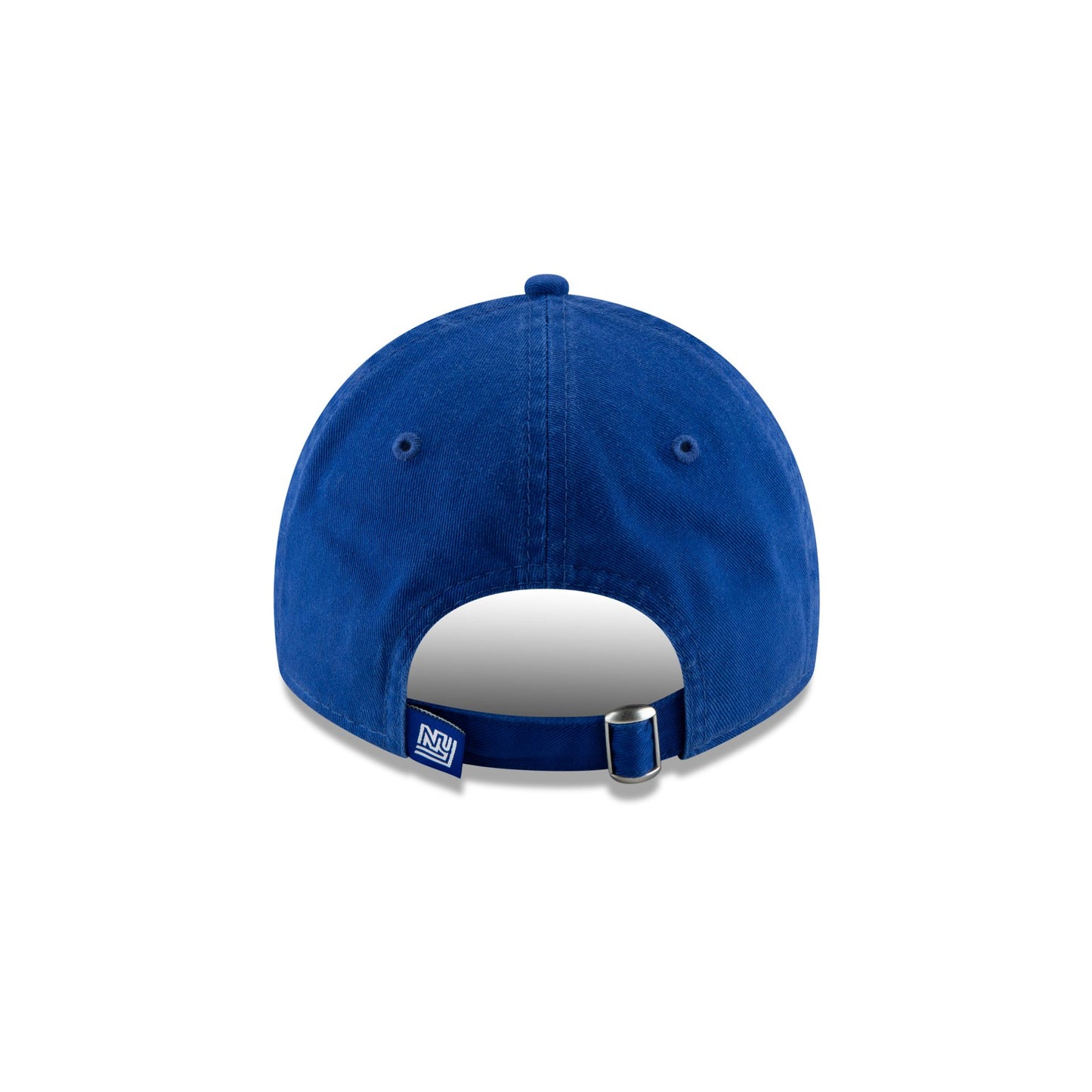 The New York Giants Core Classic Wordmark 9TWENTY Adjustable Cap features an embroidered Giants wordmark at the front panels with a woven tab displaying the team logo on a D-Ring closure at the rear.