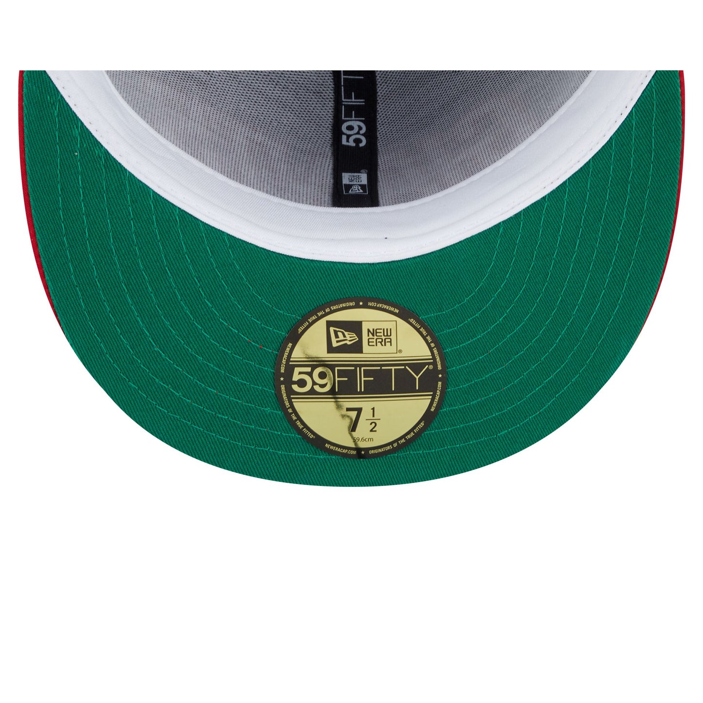 The New York Giants Spring Satin 59FIFTY Fitted Cap features an embroidered Giants wordmark at the front panels with a New Era pin at the top left panel and an NFL Shield logo at the rear. Additional details include a satin fabrication throughout, a logo at the right-wear side, and a green undervisor.