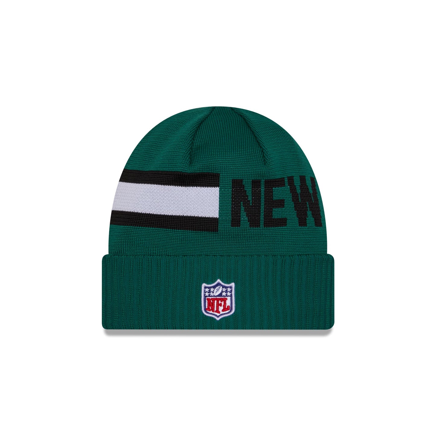 The New York Jets 2024 Cold Weather Tech Knit Beanie features an embroidered Jets logo at the front cuff with a matching NFL Shield at the rear. Additional details include a team wordmark at the right crown and a stripe at the left.