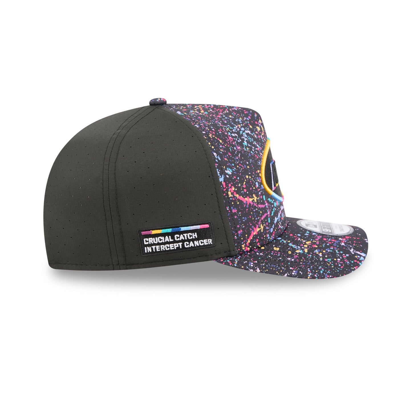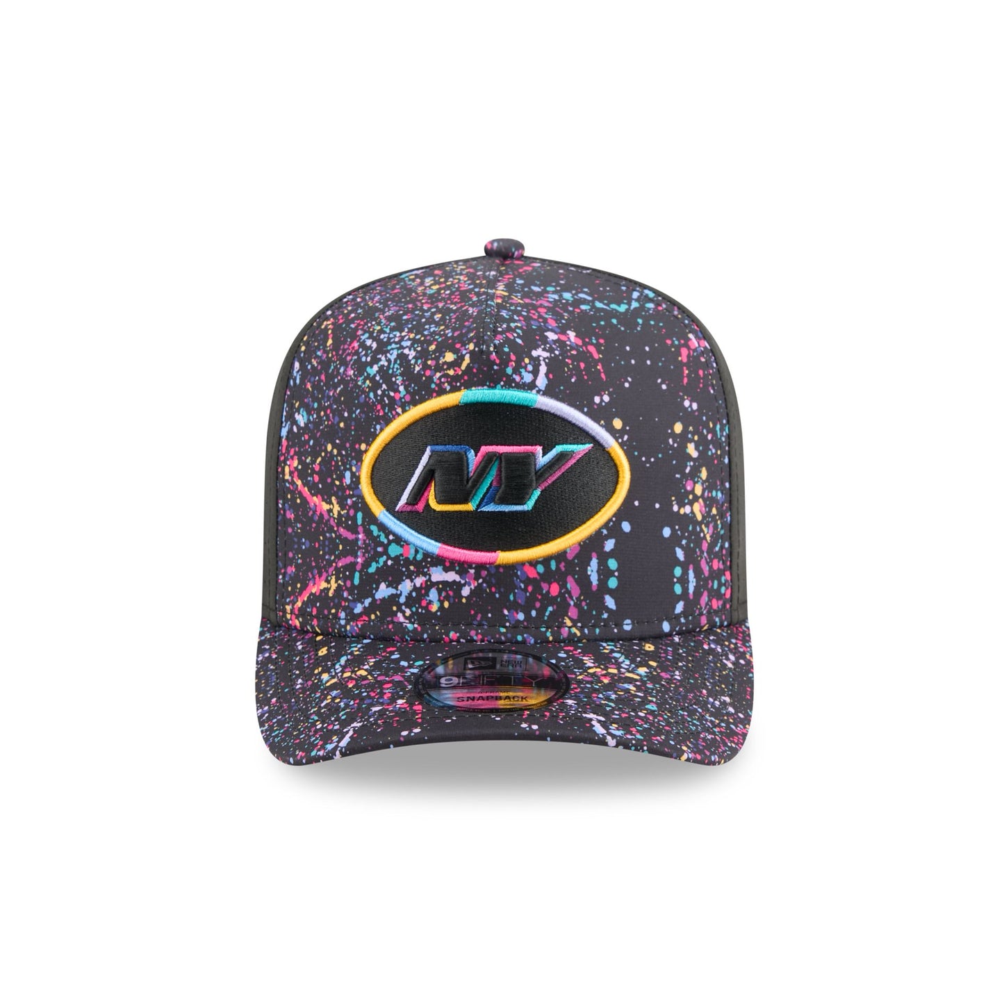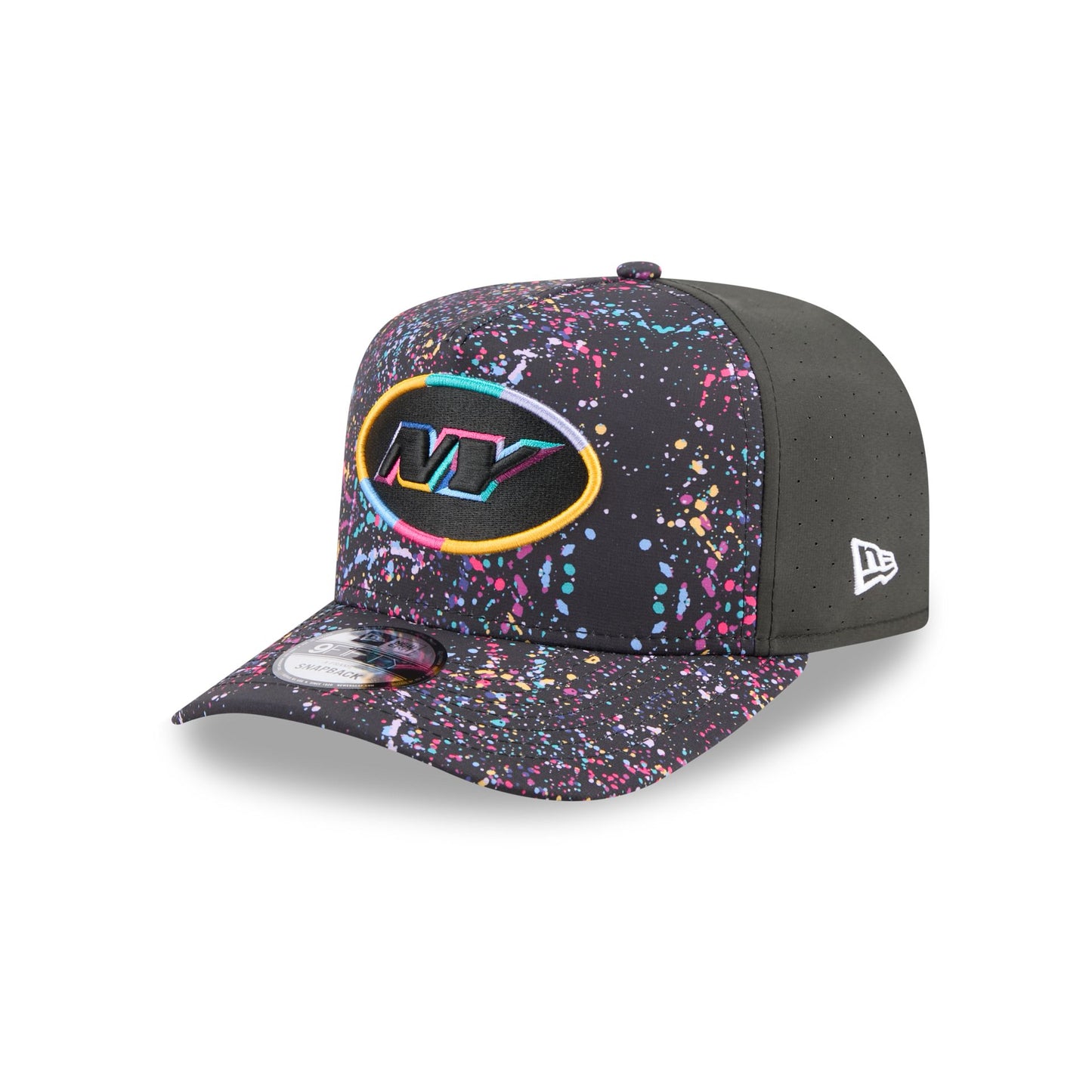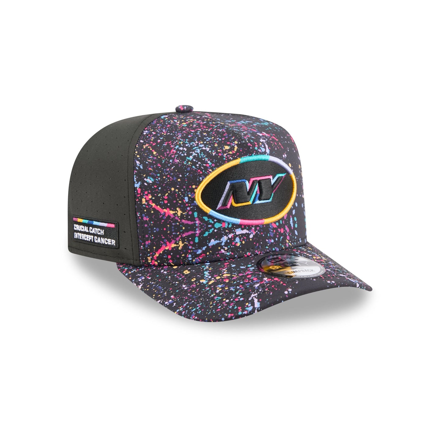 The New York Jets 2025 Crucial Catch 9FIFTY A-Frame Snapback features an embroidered Jets logo at the front paint splatter panels with a woven NFL Shield tag above a snapback closure at the rear. Additional details include a Crucial Catch Intercept Cancer patch at the right-wear side and a black undervisor.