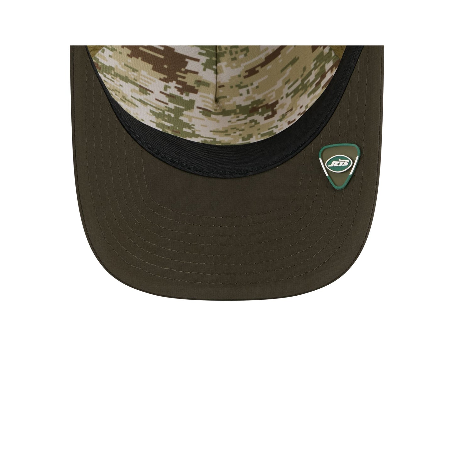 The New York Jets 2025 Salute to Service 9FORTY M-Crown A-Frame Trucker features an embroidered Jets logo at the front panel with the official NFL Salute to Service patch above a snapback closure at the rear. Additional details include an American flag patch at the right-wear side with a silicone team logo patch at a dark green undervisor and a digi camo interior fabrication.