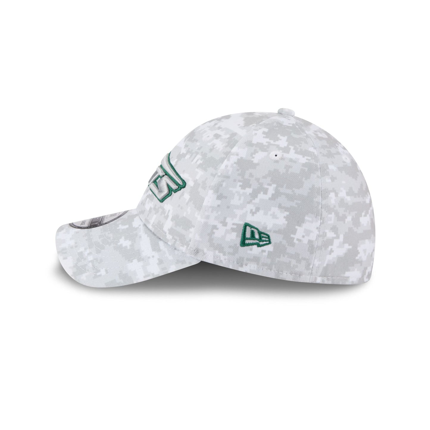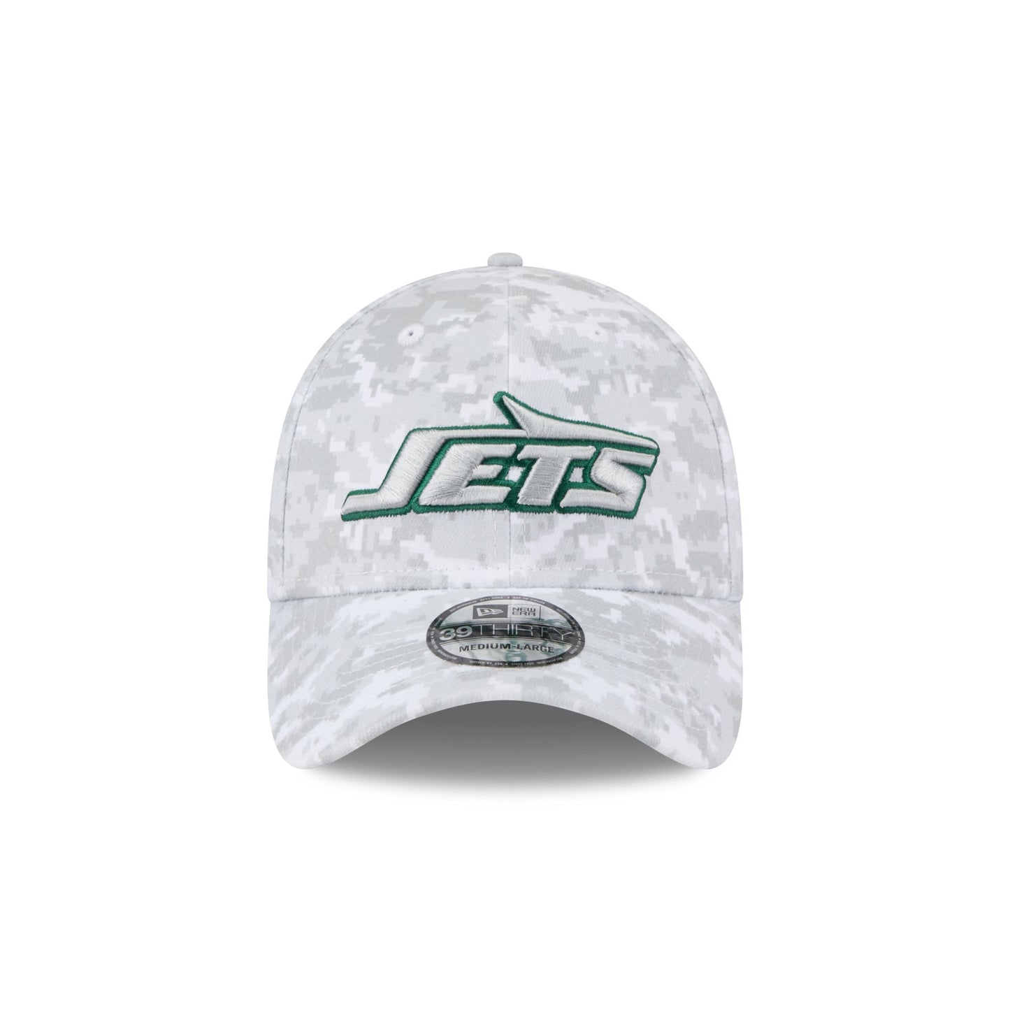 The New York Jets 2025 Salute to Service Fan Gear 39THIRTY Stretch Fit Cap features an embroidered Jets logo at the front panels with the official NFL Salute to Service patch at the rear, an American flag patch at the right-wear side, and a team color undervisor.