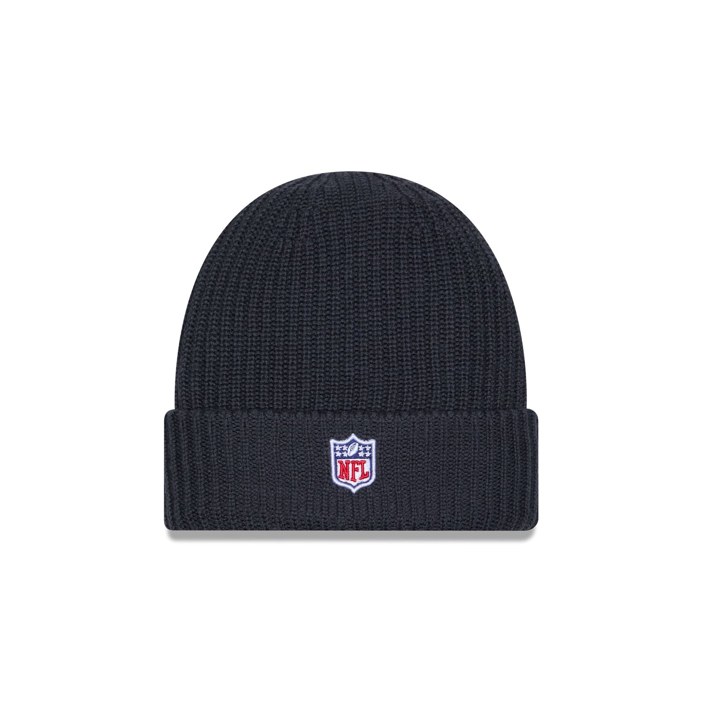 The New York Jets 2025 Sideline Cold Weather Steel Clouds Cuff Knit Beanie features a sewn-down silicone Jets logo patch at the front cuff with a matching Official NFL Shield logo at the rear. The beanie is knit from wool yarn and lined with fleece.