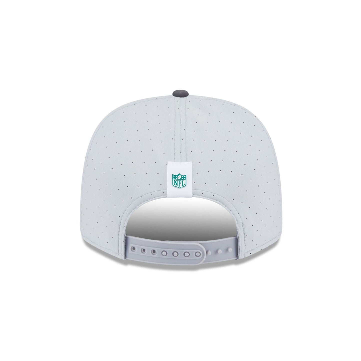 The New York Jets 2025 Training Gray 9SEVENTY Stretch-Snap Cap features a silicone Jets patch at the front panels with team color stripes at the front of a gray visor. Additional details include a silicone NFL Shield patch on a woven foldover tab above a snapback closure at the rear.