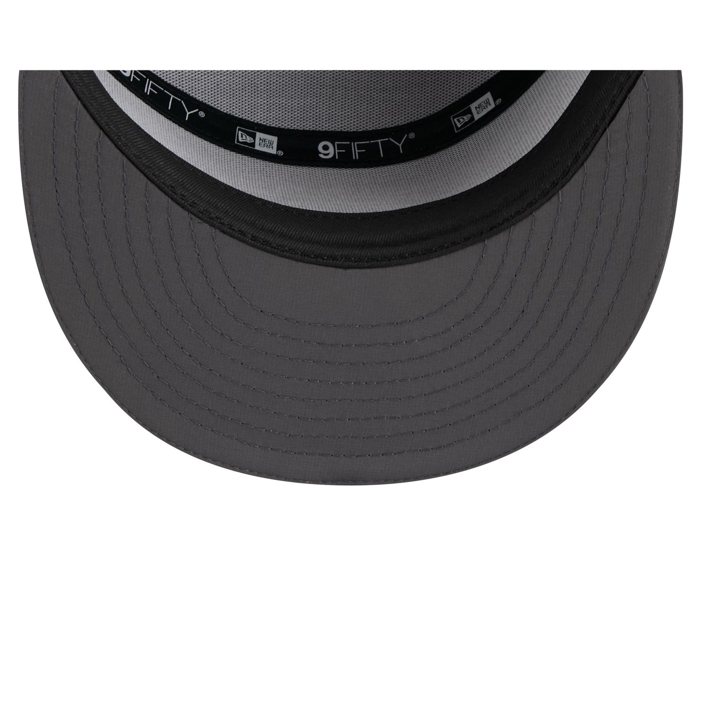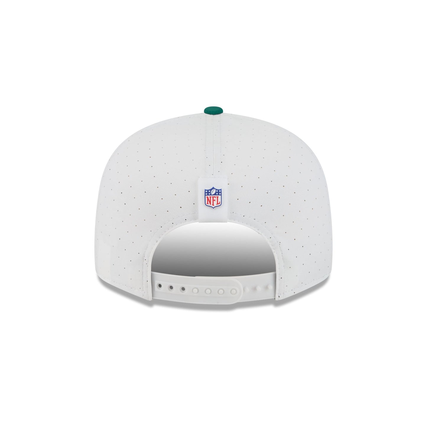 The New York Jets 2025 Training Split Panel 9FIFTY Snapback features a silicone Jets patch at the front panel with team color stripes at the front of a green visor. Additional details include a silicone NFL Shield patch on a woven foldover tab above a snapback closure at the rear.