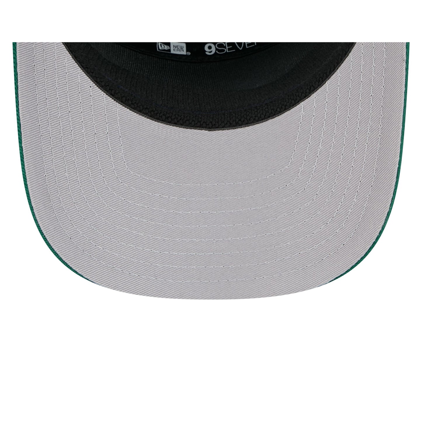 The New York Jets Split Panel 9SEVENTY Stretch-Snap features an embroidered Jets logo at the front panel with a split crown construction and a rope at the visor. Additional details include an adjustable stretch-snap closure at the rear and a gray undervisor.