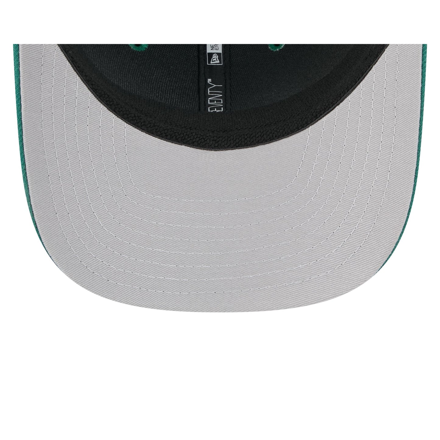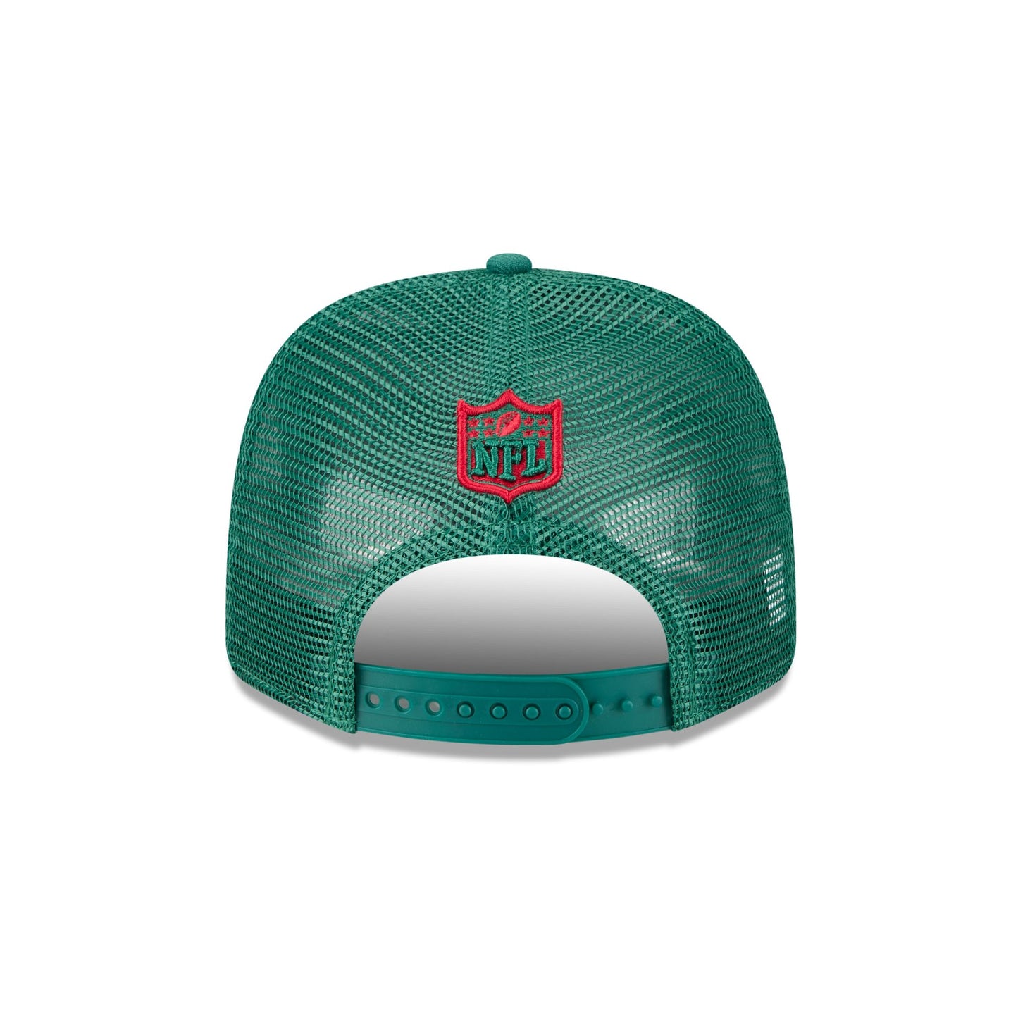 The New York Jets Team 9SEVENTY Trucker features an embroidered Jets logo at the front panels with a matching NFL Shield logo above an adjustable snapback closure at a mesh rear and a gray undervisor.