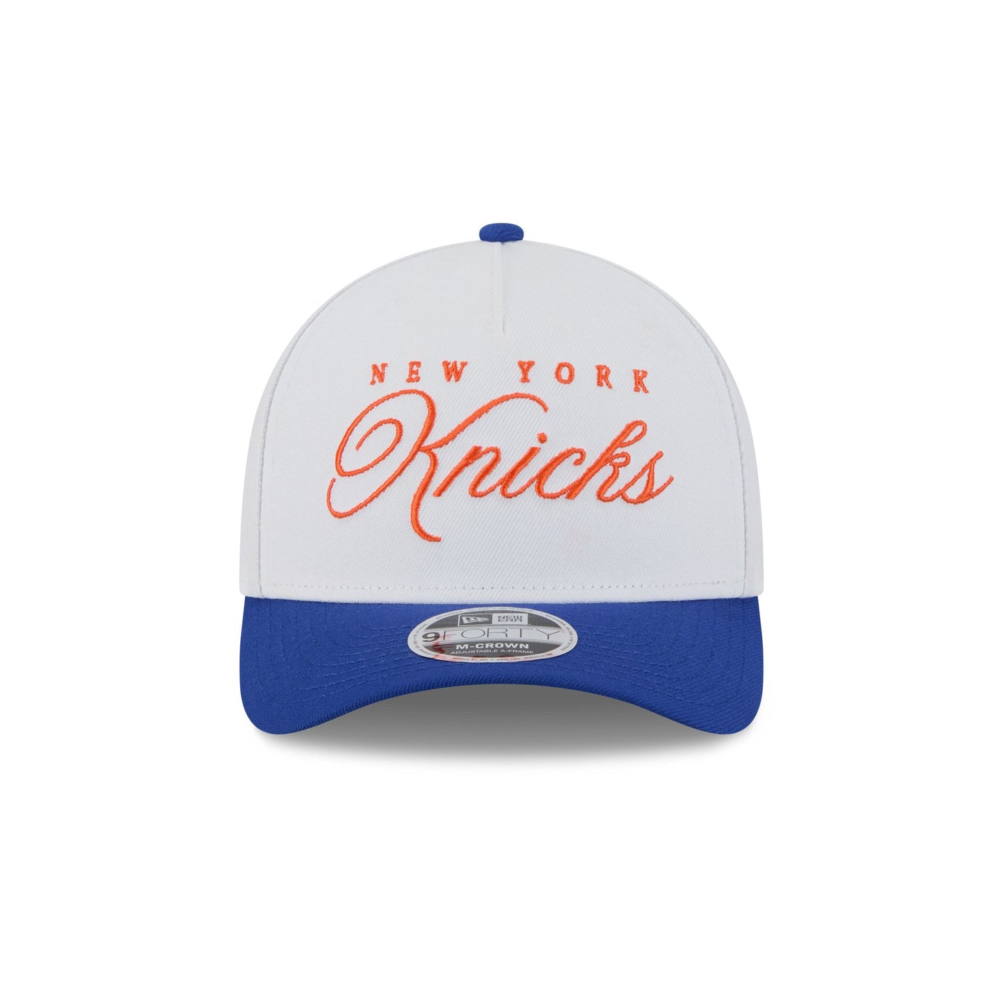 The New York Knicks 2025 Draft 9FORTY M-Crown A-Frame Snapback features an embroidered Knicks script wordmark at the front panels with a team logo at the right-wear side. Additional details include a woven silicone NBA Logoman patch above an adjustable snapback closure at the rear and a gray undervisor.