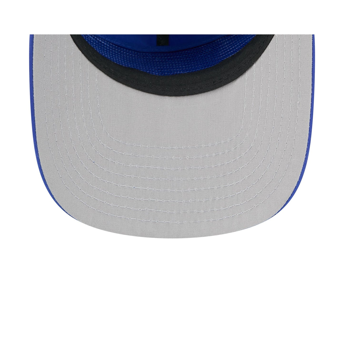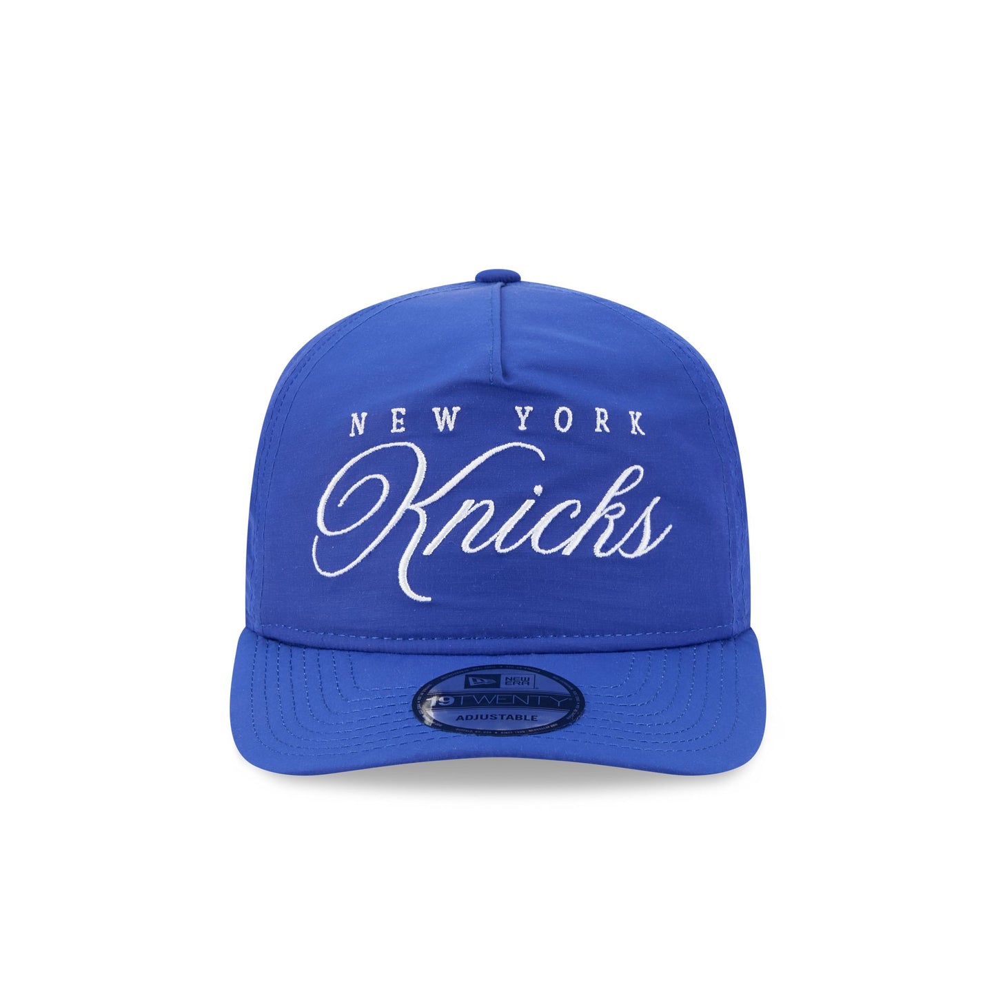 The New York Knicks 2025 Draft Blue 19TWENTY Adjustable Cap features an embroidered Knicks script wordmark at the front panels with a team logo at the right-wear side. Additional details include a woven silicone NBA Logoman patch above an adjustable buckle closure at the rear and a gray undervisor. The strap features a National Basketball Association gel print wordmark.