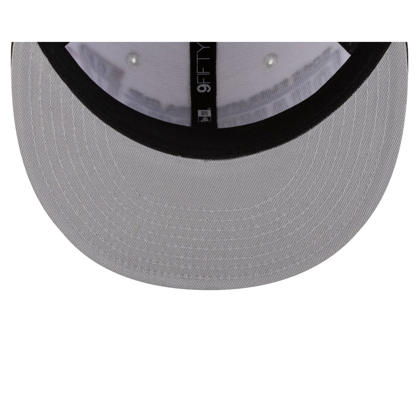 The New York Knicks 2025 Emirates Cup Champions 9FIFTY Snapback features an embroidered 2025 Emirates NBA Cup Champions graphic at the front panels with a Knicks logo at the right-wear side. Additional details include the NBA Logoman above an adjustable snapback closure at the rear and a gray undervisor.