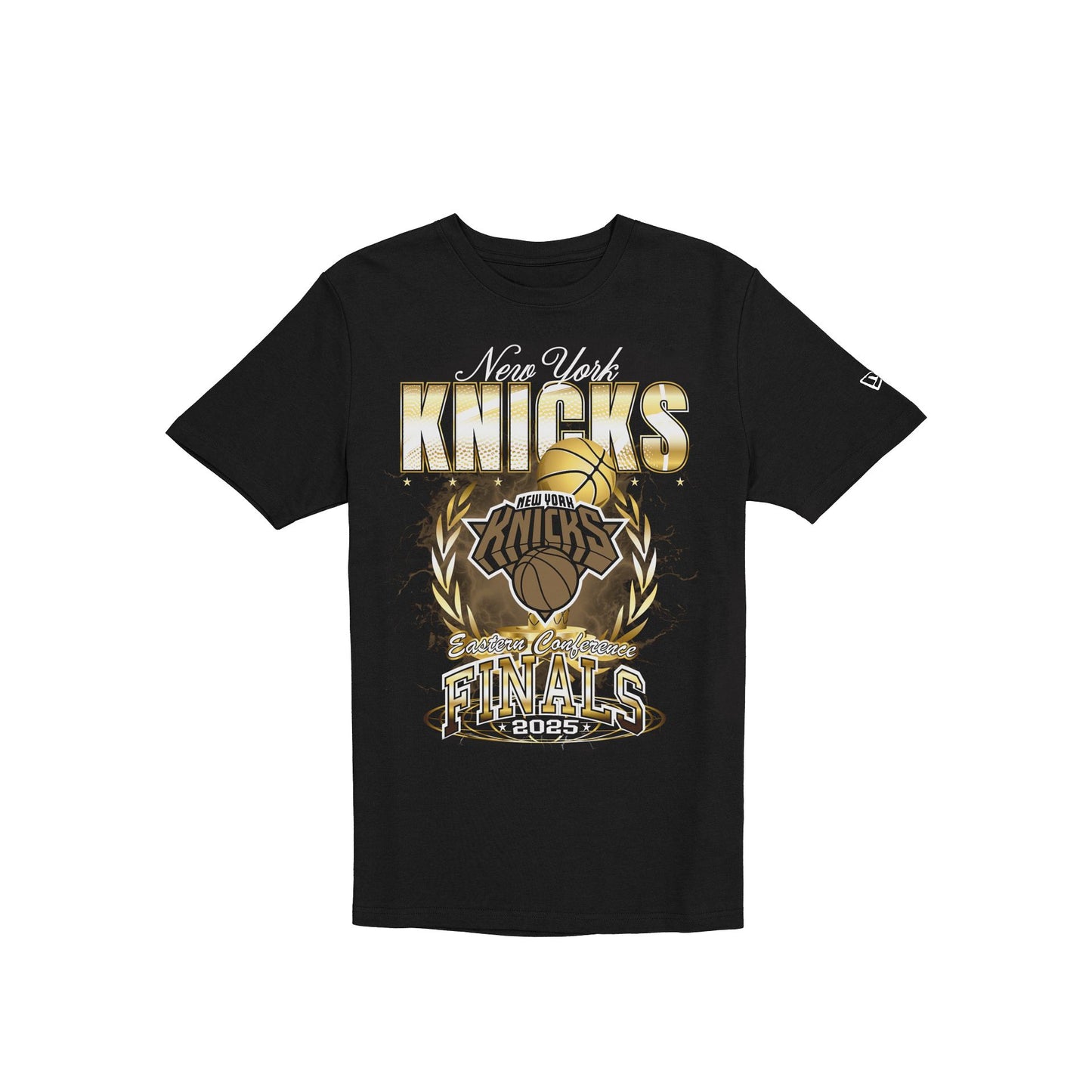 The New York Knicks 2025 NBA Eastern Conference Finals Gold T-Shirt features a screen-printed Knicks graphic at the front.