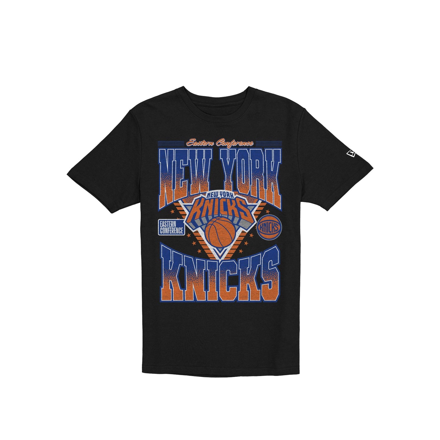 The New York Knicks 2025 NBA Playoff Black T-Shirt features a screen-printed Knicks graphic at the front.