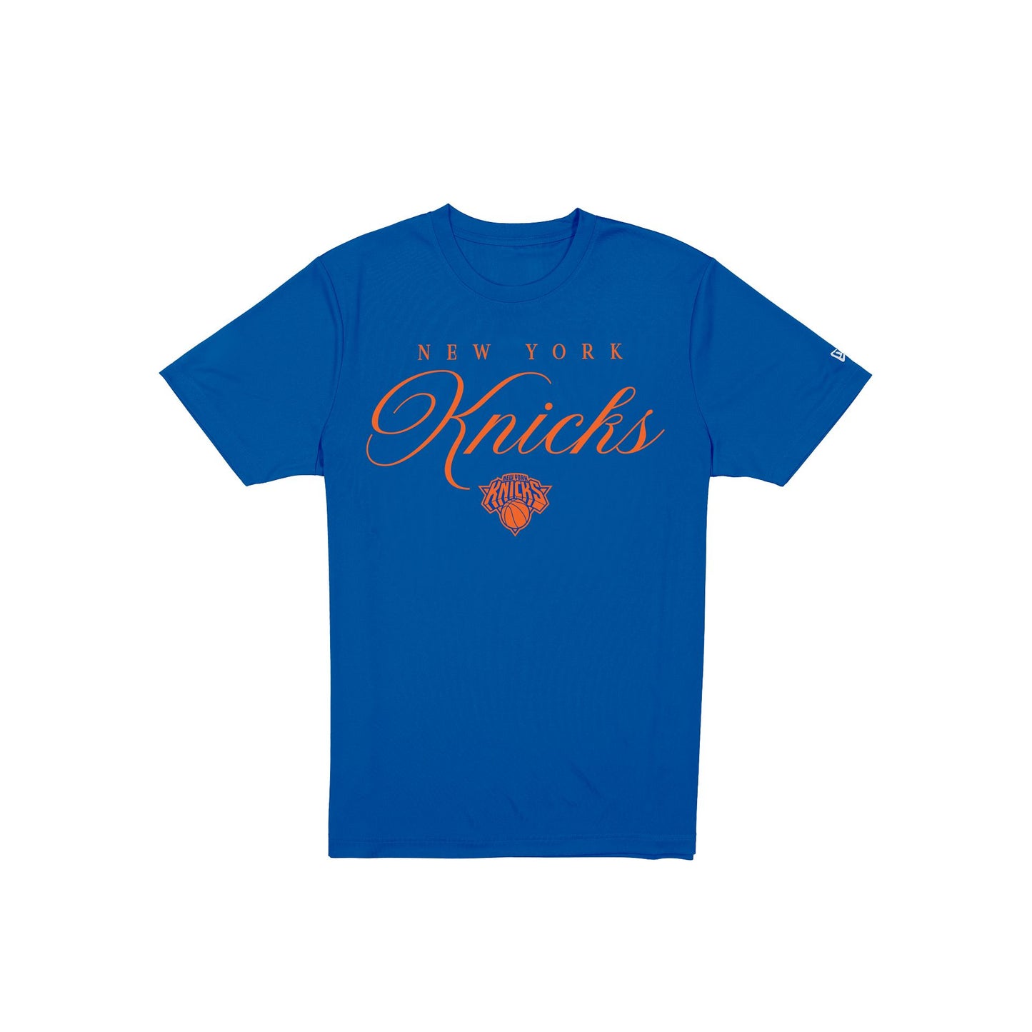 The New York Knicks 2025 NBA Playoff Blue T-Shirt features a screen-printed Knicks wordmark above a team logo at the chest.