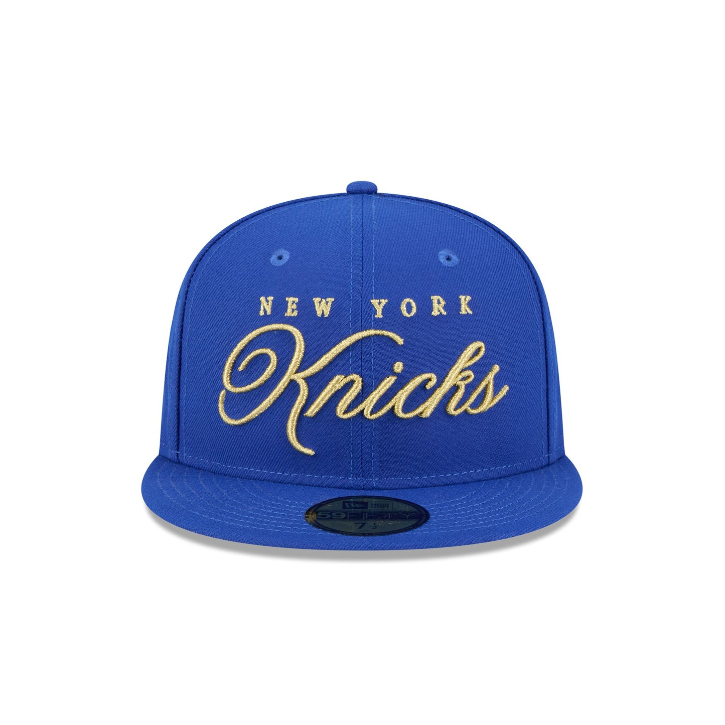 The New York Knicks 2026 All-Star Game Script Shine 59FIFTY Fitted Cap features an embroidered Knicks gold script at the front panels with the NBA All-Star Game logo at the right-wear side. Additional details include the NBA Logoman at the rear and a gray undervisor.