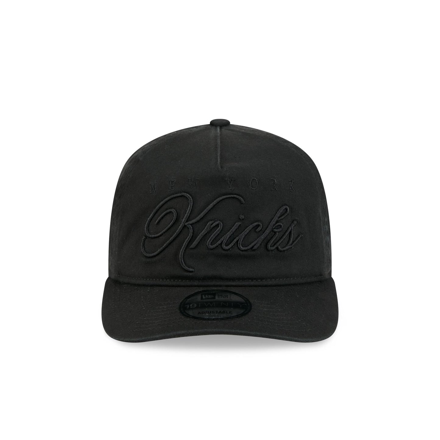 The New York Knicks All Black Scripted 19TWENTY Adjustable Cap features an embroidered Knicks all black script wordmark at the front panels with a matching team logo at the right-wear side. Additional details include an adjustable snapback closure at the rear and a gray undervisor.