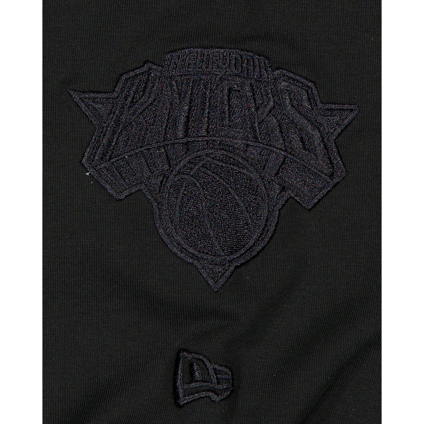 The New York Knicks Black on Black Logo Select Hoodie features a satin applique with a tonal stitch Knicks wordmark at the chest and an embroidered team logo at the left-wear sleeve.