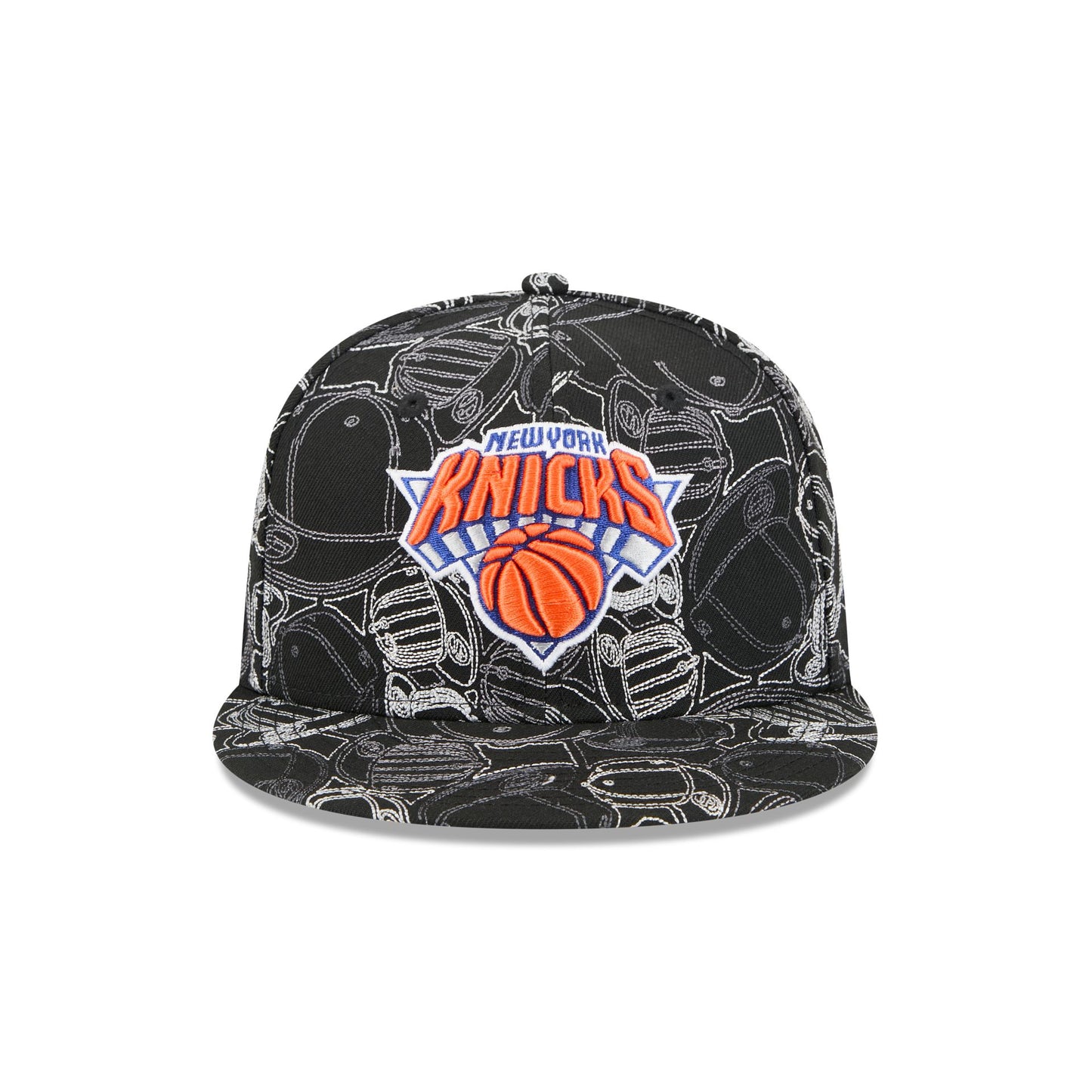 The New York Knicks Cap Scramble 59FIFTY Fitted Cap features an embroidered Knicks logo at the front panels with chainstitched allover cap patterned fabrication, an NBA Logoman at the rear, and a gray undervisor.