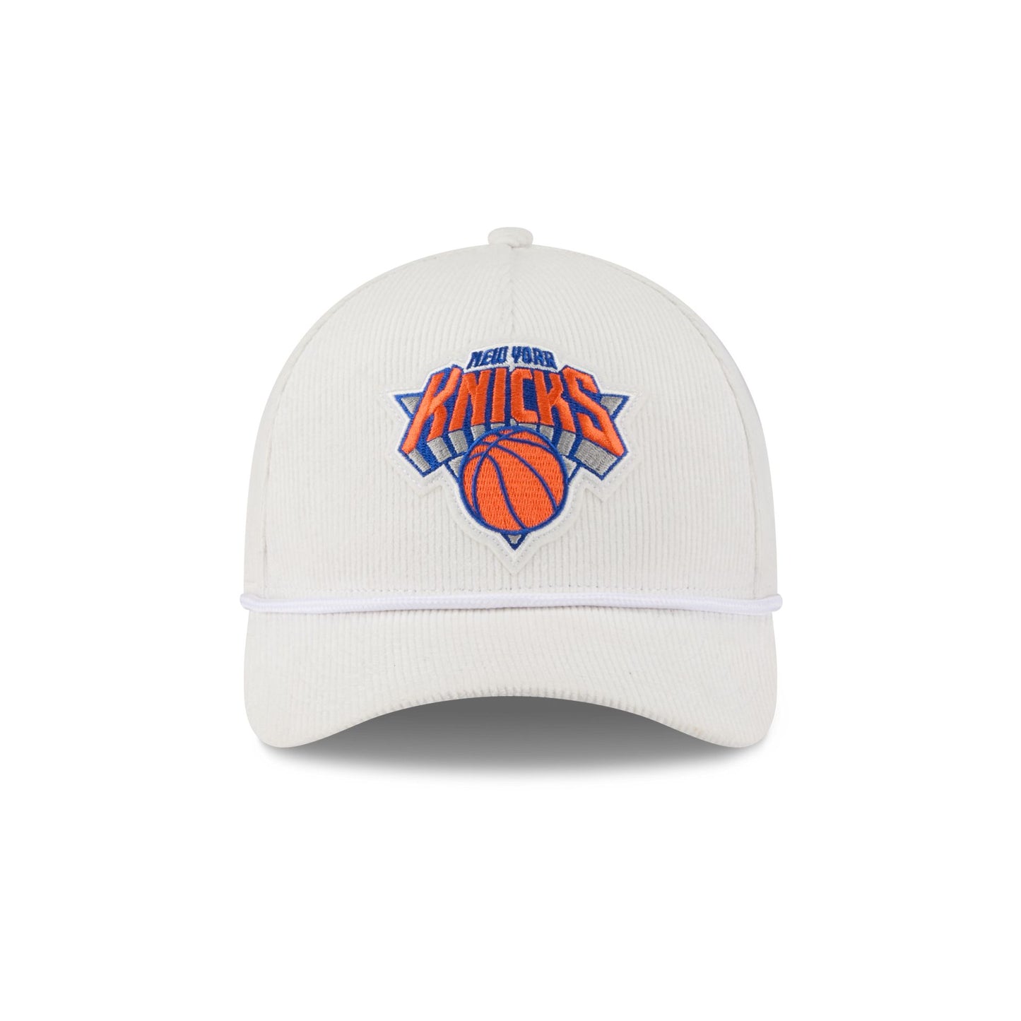 The New York Knicks Corduroy 9FORTY M-Crown A-Frame Snapback features an embroidered Knicks logo at the front panels with a corduroy fabrication throughout and a rope at the visor. Additional details include a snapback closure at the rear and a gray undervisor.