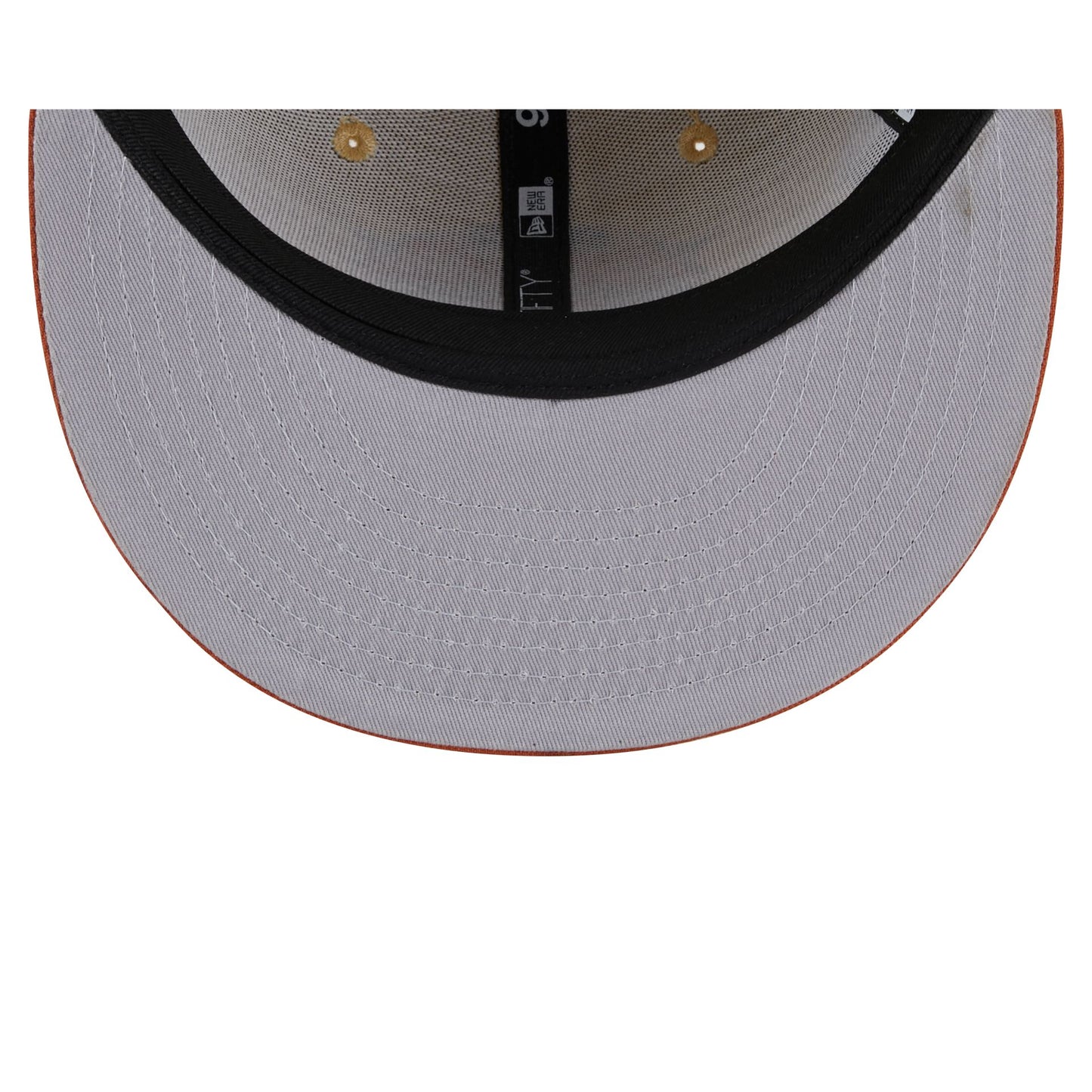 The New York Knicks Fall Landscape 9FIFTY Snapback features an embroidered Knicks logo at the front panels with a fall landscape at the right-wear side, a gray undervisor, and a snapback closure at the rear.