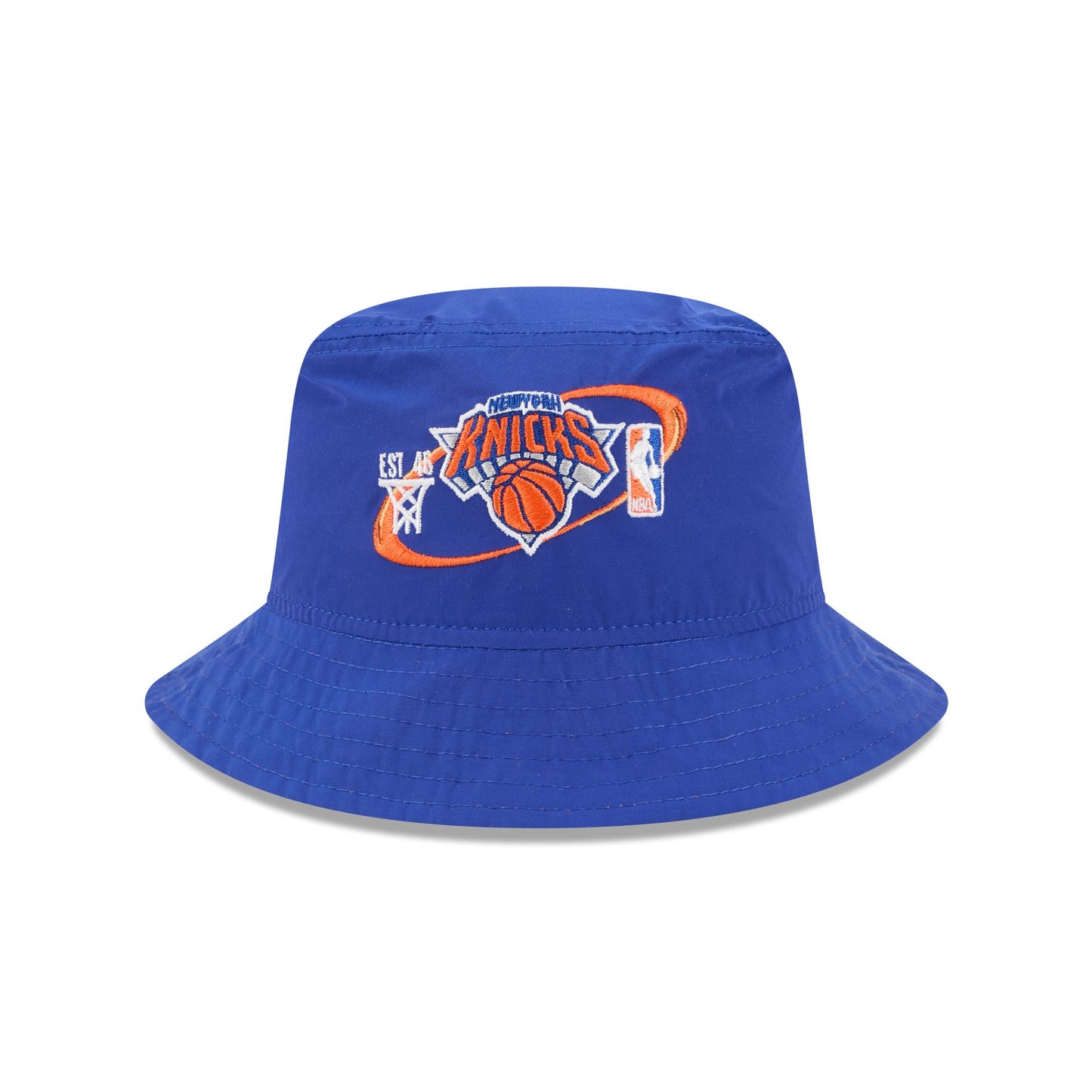 The New York Knicks Nylon Logo Bucket Hat features an embroidered Knicks logo, establishment date, and NBA Logoman at the front.