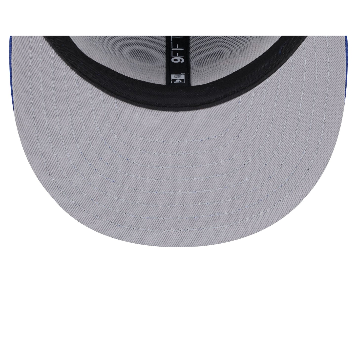 The New York Knicks Kids 9FIFTY Snapback Hat features an embroidered Knicks wordmark at the front panels with a matching team logo at the right-wear side. Additional details include a gray undervisor and a snapback closure at the rear.