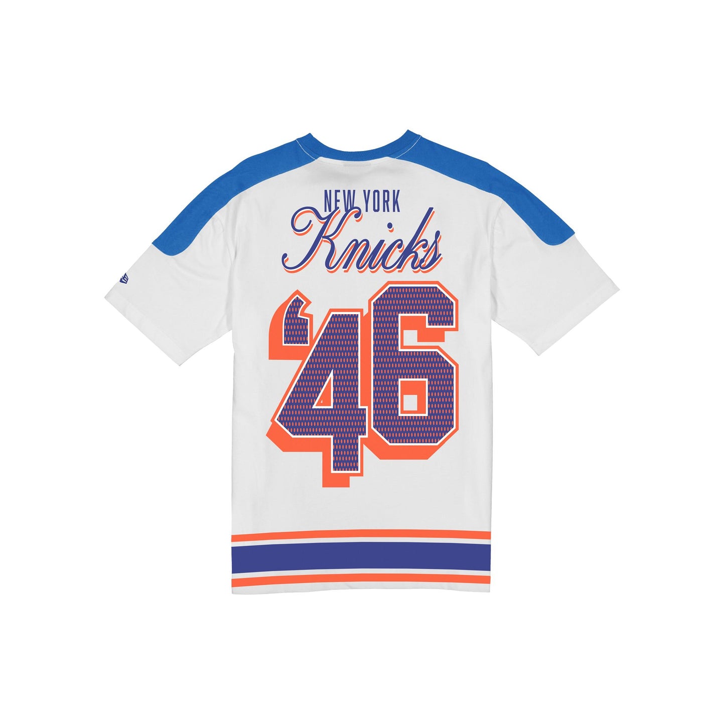 The New York Knicks Sport Classics Vintage White Oversized T-Shirt features a screen-printed Knicks wordmark and graphic at the front with woven team jocktag at the bottom hem. Additional details include team color stripes at the shoulders and hem with a team wordmark above a '46 established year jersey number at the rear.