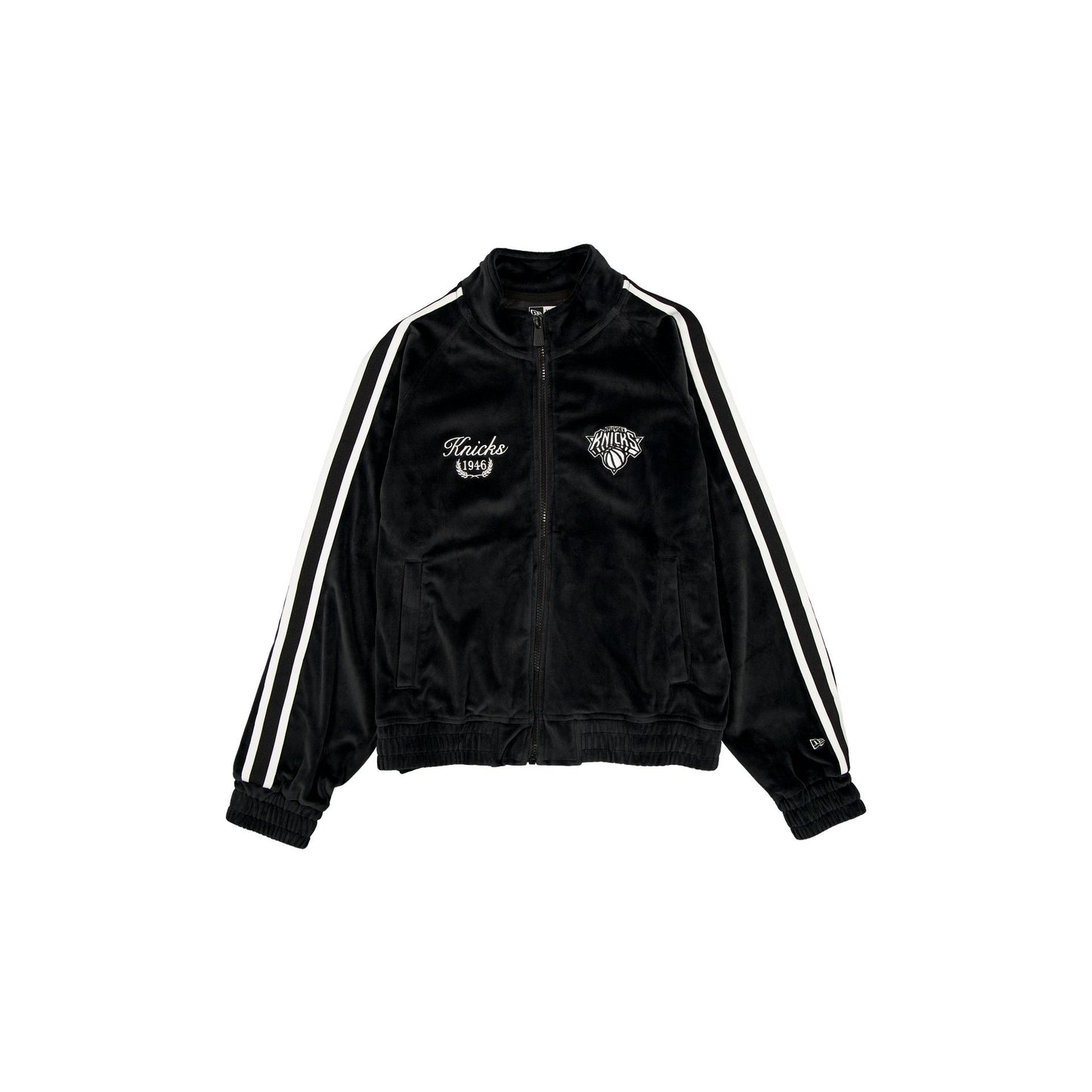 The New York Knicks Throwback Prep Black Women's Track Jacket features an embroidered Knicks logo at the left chest and script wordmark at the right. Additional details include a full-zip closure and front pockets.
