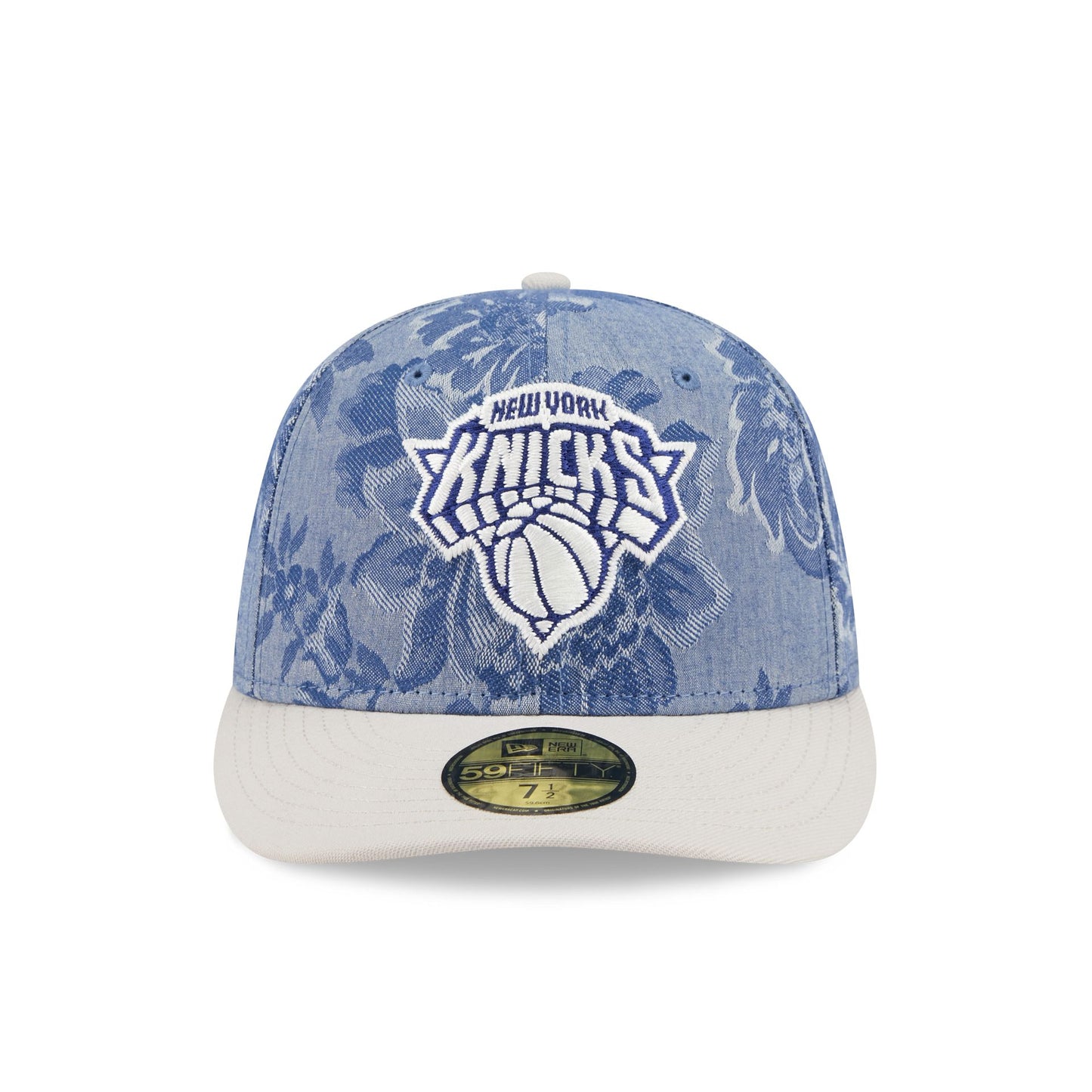 The New York Knicks Two-Tone Denim 59FIFTY Fitted Cap features an embroidered Knicks logo at the front panels against a specialty Japanese milled gobline chambray fabrication from Three Looms Japan Fabrics throughout the cap. Additional details include an NBA Logoman at the rear and a gray undervisor.